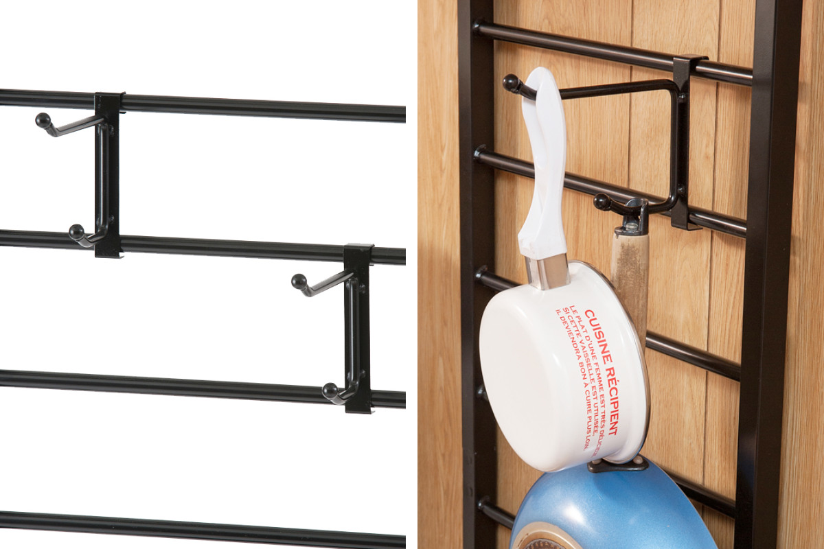 フライパンやハンガーなどを掛けられる、上下ダブルフックが5個付いています。ラダー部分の好きな場所に移動できます。