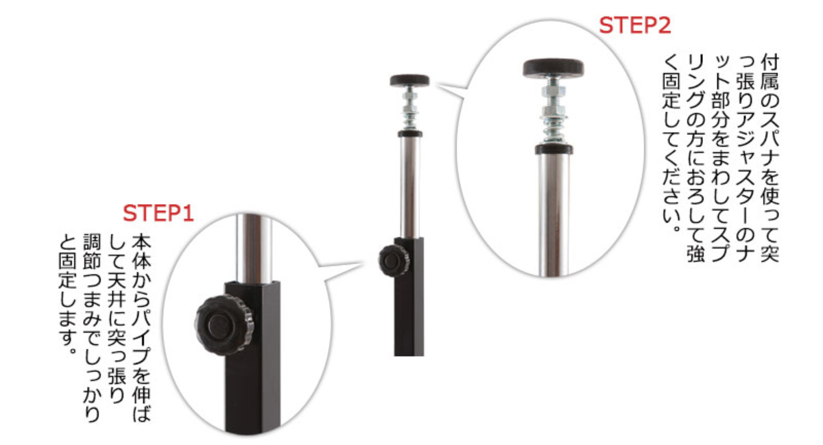 突っ張り棒で天井と床を突っ張ることで、簡単に固定ができます。壁に穴を開けずに収納が増やせるので、賃貸やワンルームにもおすすめです。