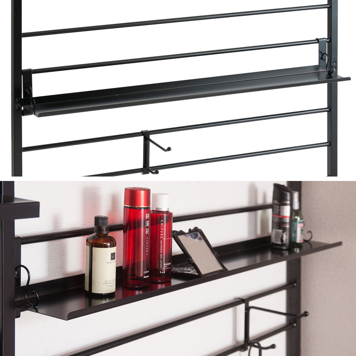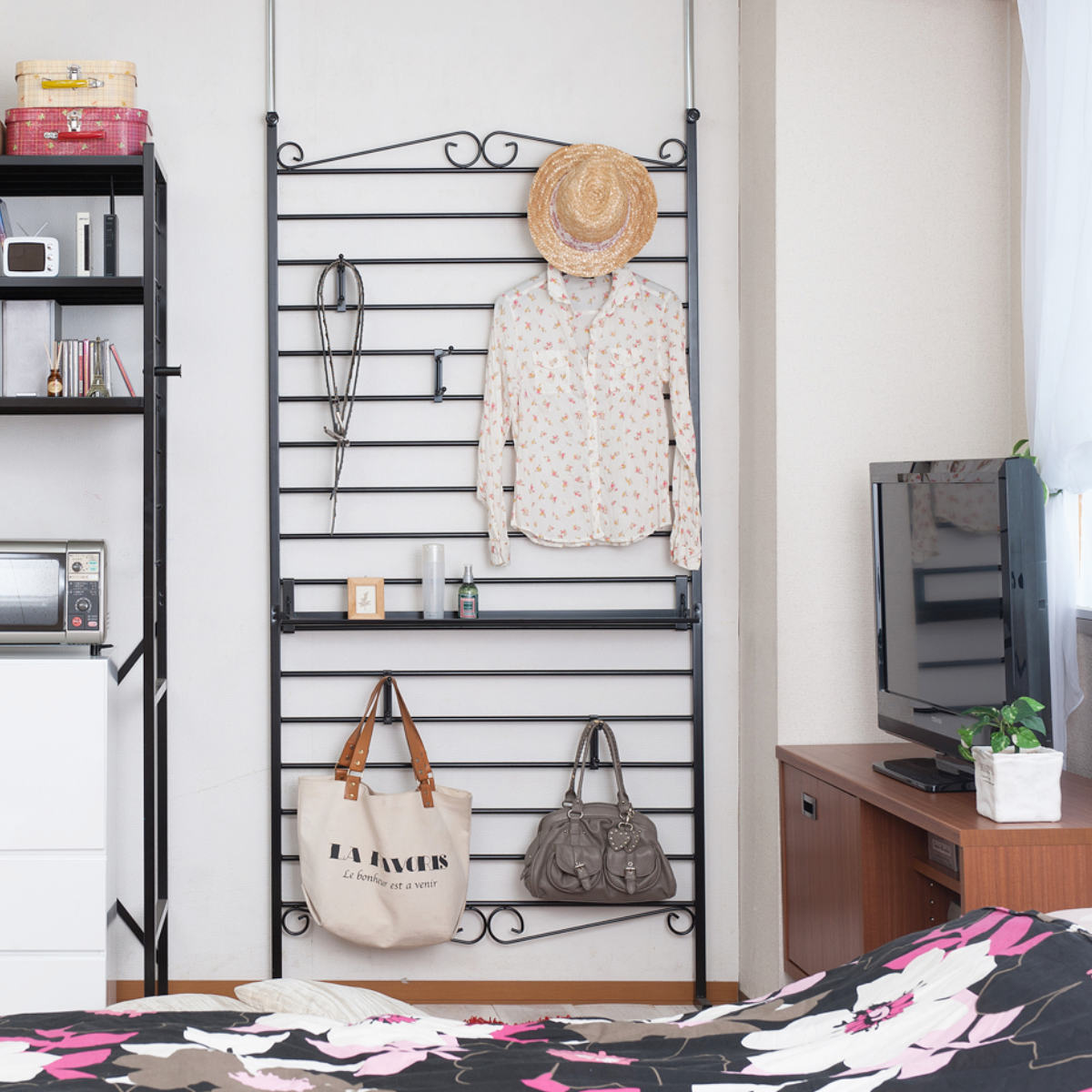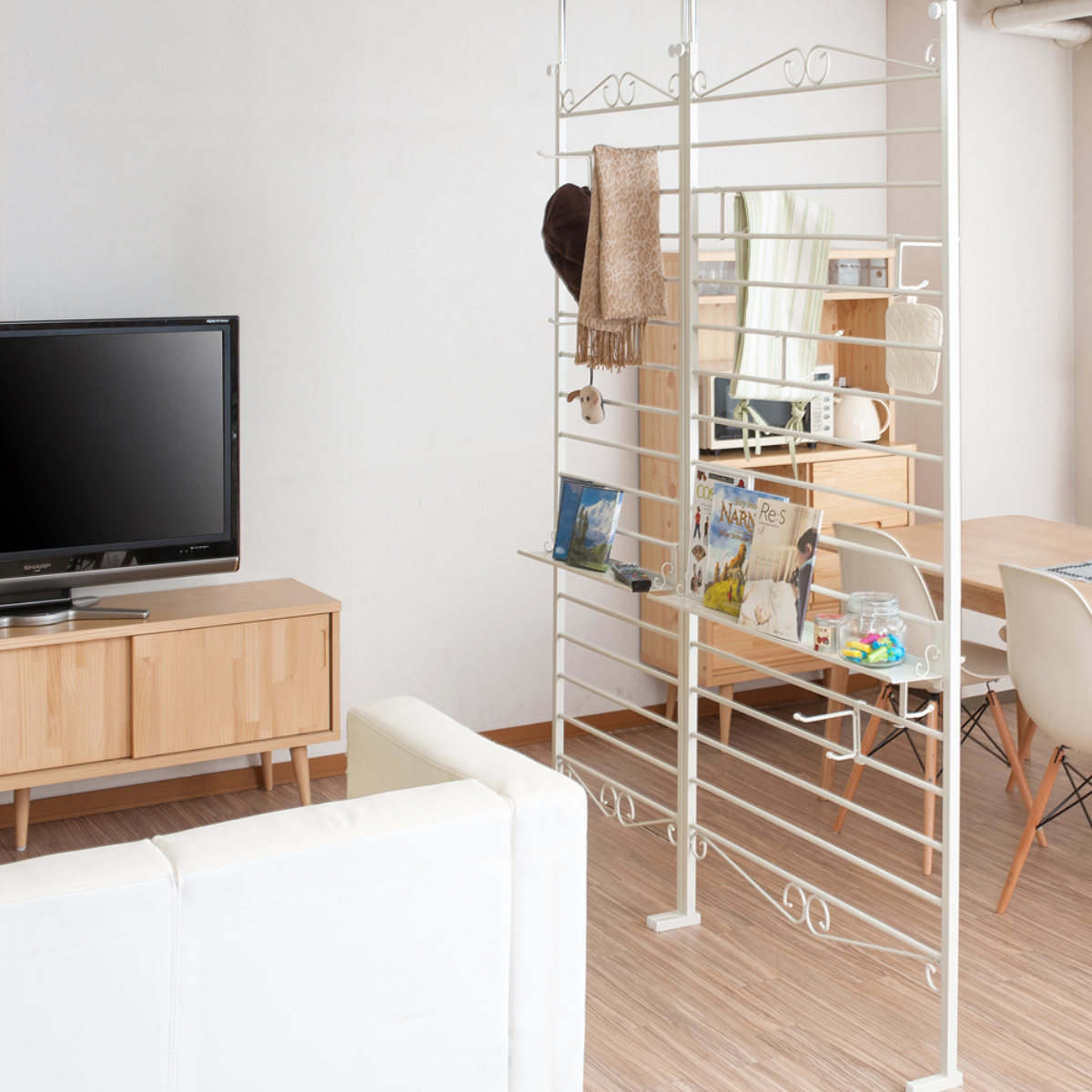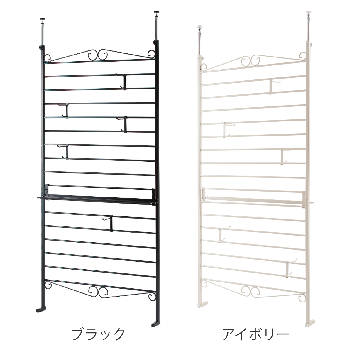 壁面収納としてだけではなく、お部屋の間仕切りとしてもご使用いただけます。スチール製のラダーは、圧迫感を与えずに空間を仕切ることができます。付属のフックや棚は両面に掛けられます。