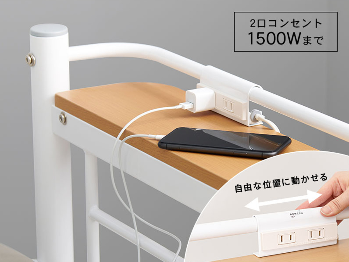 目覚まし時計やメガネをおくことができる便利な宮棚付きです。コンセント部分は左右にスライドできるので、お好みの位置でお使いいただけます。