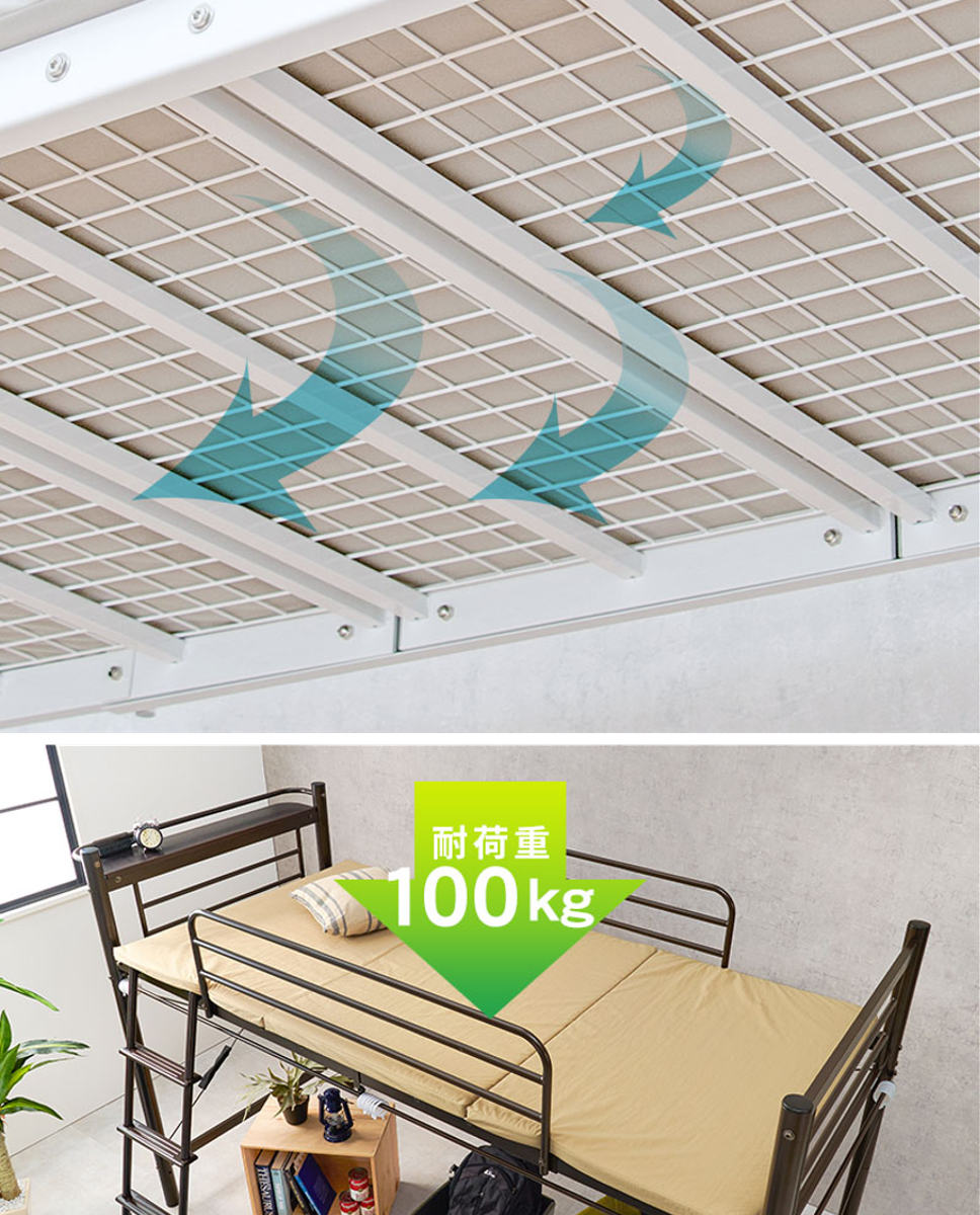 通気性が良くカビが発生しにくいスチール製のメッシュ床板です。汗や湿気を逃し、年中快適に睡眠をとることができます。ベッドを支えるパイプは直径約5cm、耐荷重100kgでお子様から大人の方まで幅広くお使いいただけます。
