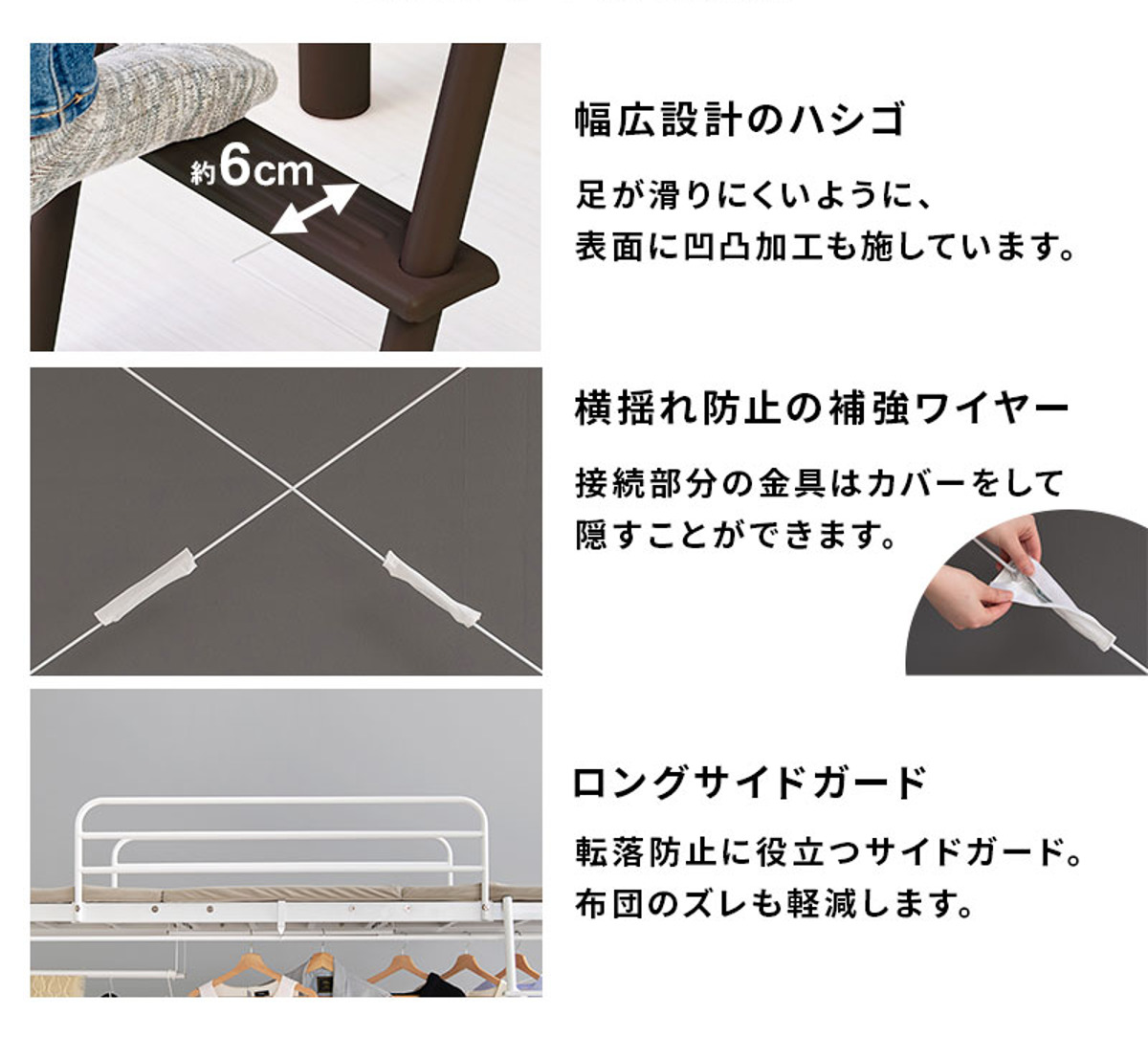ハシゴの位置は、左右どちらにでも設置可能です。お部屋のレイアウトに合わせて付け替えることができます。ネジ2本で固定するので、毎日の昇り降りの際にも安心です。