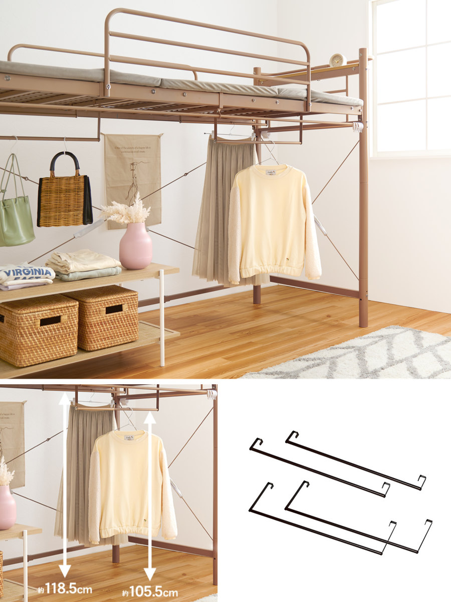 ハンガーポール付きなので、ベッド下のスペースをクローゼットのように使うことができます。短いポール2本、長いポール2本の合計4本のポールが付属しています。トップスやスカート、ジーンズなどを掛けるのに最適な高さです。