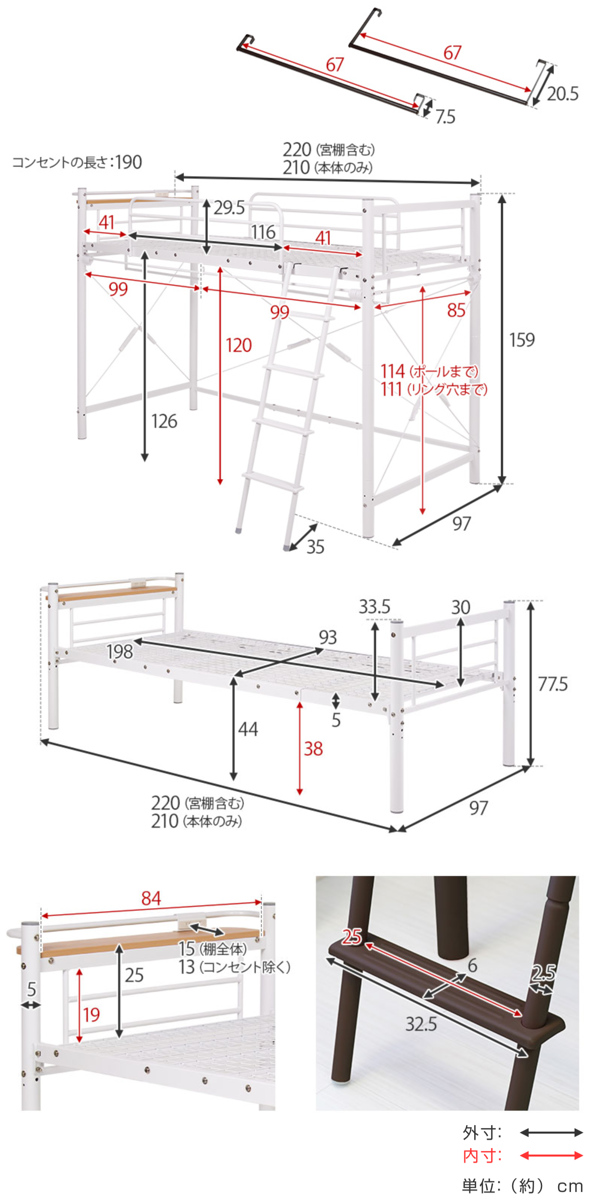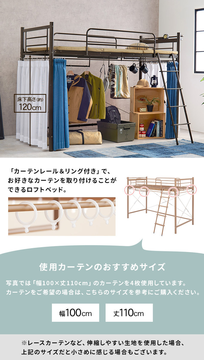 ロフトベッド シングル ミドルタイプ カーテン取付可能 2口コンセント付 2WAY