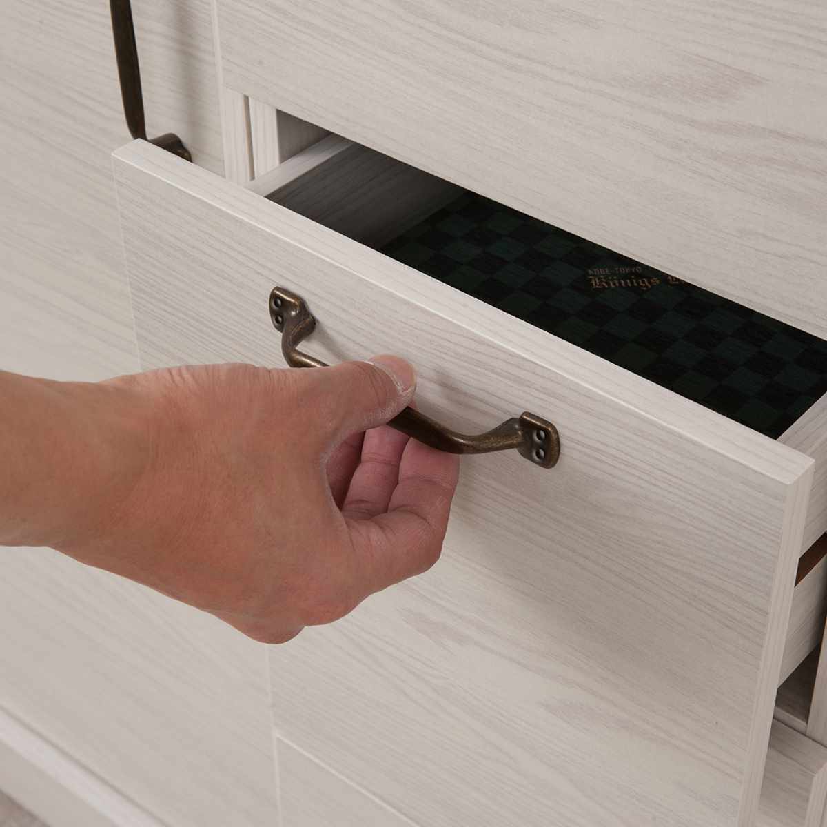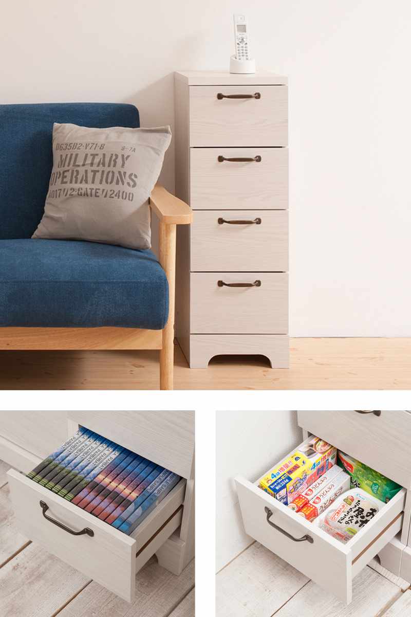 4段の引出しには、文庫本やDVD、リビングでごちゃつきがちな小物類などを収納できます。カトラリーやラップ、レトルト食品など、キッチン周りの物もスッキリ整理整頓でき、大変便利です。