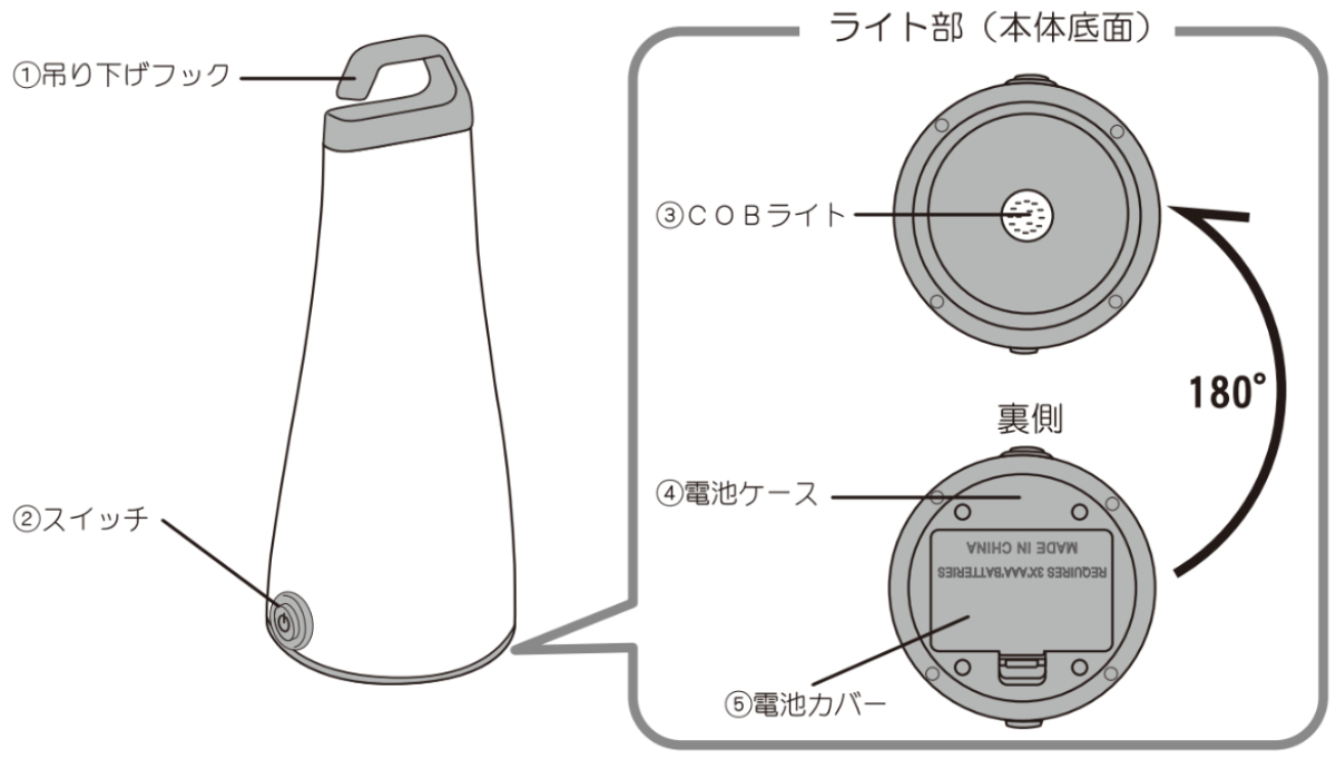 ライトを内側にすると、テーブルライトやランタンとして。ライトを外側にすると、懐中電灯としてお使いいただけます。