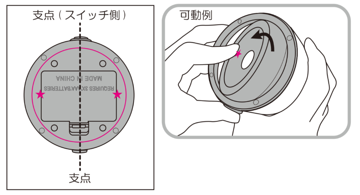 ライト部(本体底面は)視点を中心に回転します。図の★の付近どちらか、片側を指で押すと赤枠の部分が可動します。