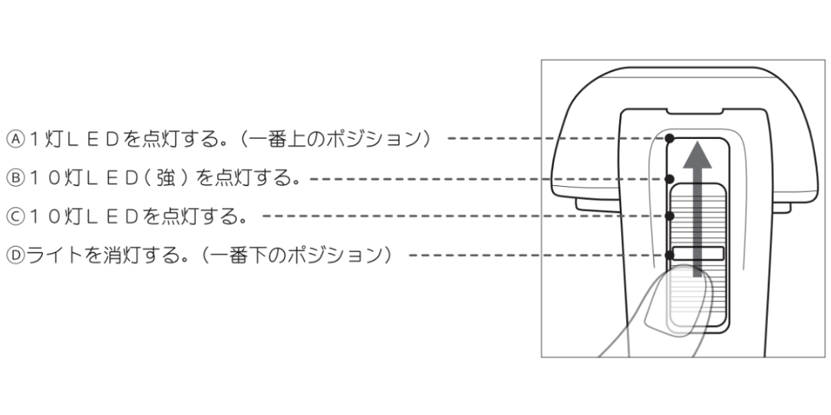 ライトのスイッチは3段階にスライドして点灯させます。スライドすると「カチッ」と音がします。