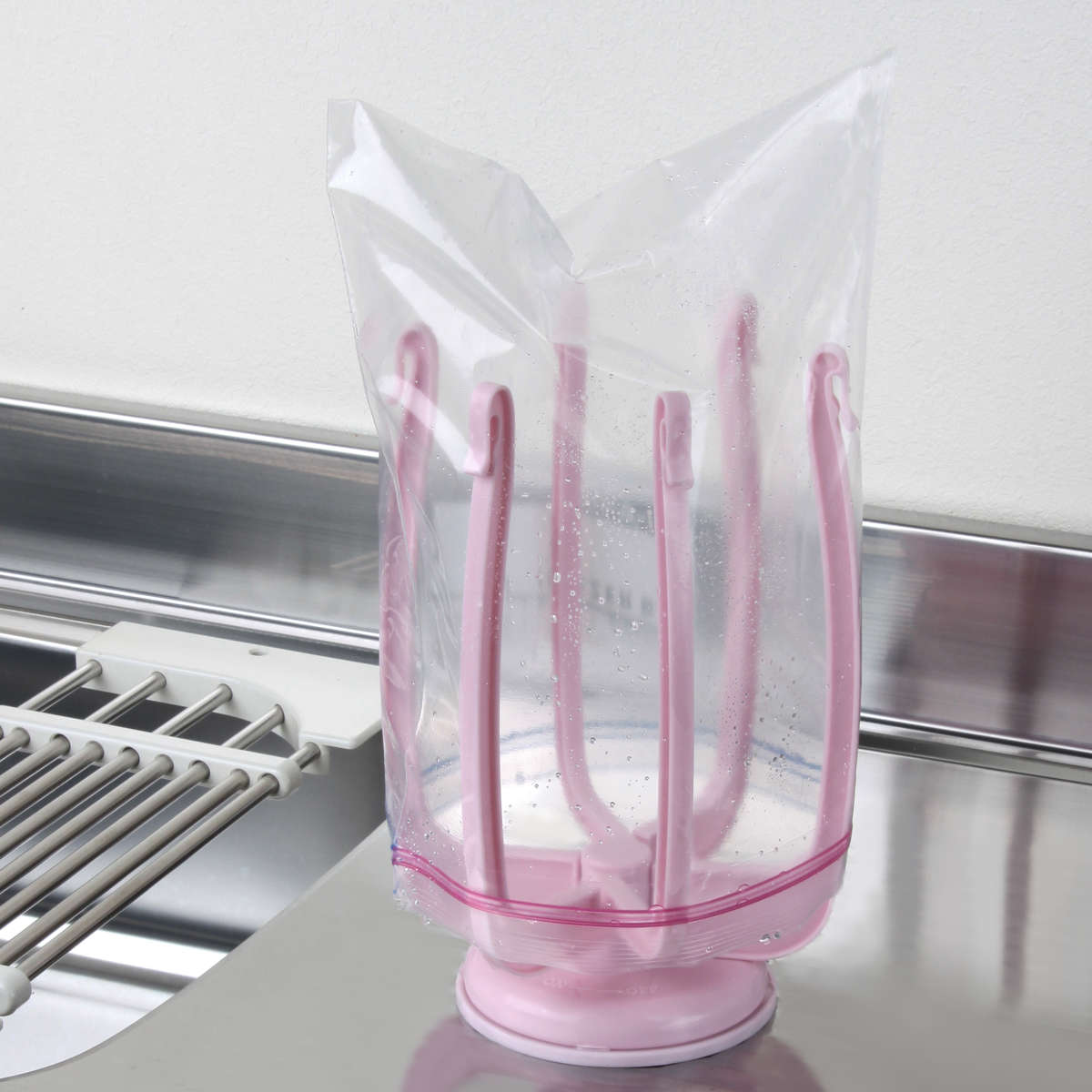 吸盤でしっかり安定して動きづらくなるので、袋やスタンドがずれるリスクが減ります。料理の残り物やカレーやスープなどの液体を、安心して保存袋に楽に移し替えることができます。チャック部分を折り返してスタンドに掛ければ、袋を手で支えずとも安定します。