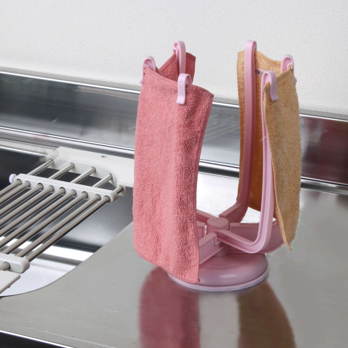 先端部分は挟める形状で、濡れたタオルやふきんを掛けることもできます。広げて干せる形状なので空気が良く通り、衛生的に使えます。