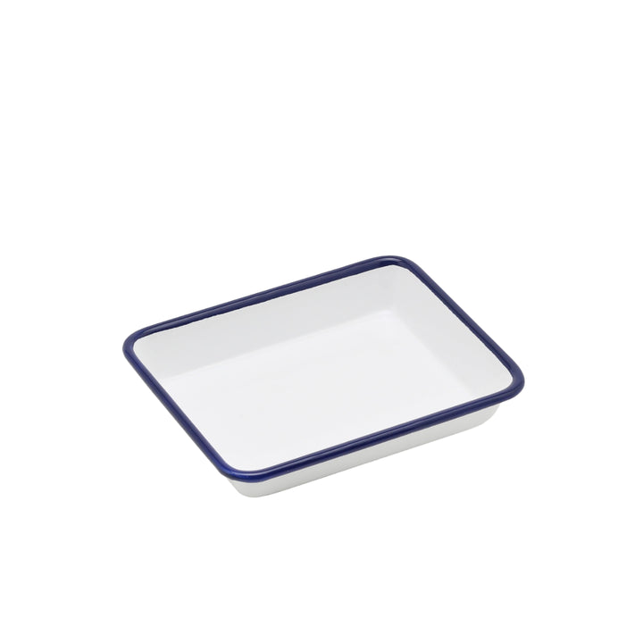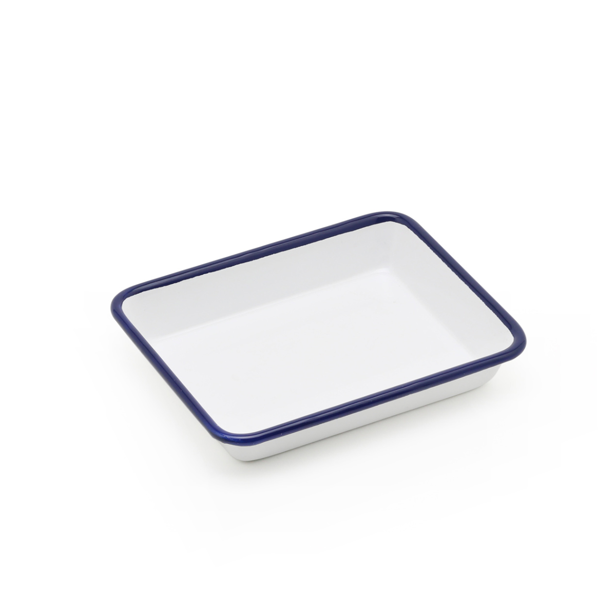 清潔感のあるネイビーの縁取りの角バットです。直火OKでオーブンでも使えるので、料理の下ごしらえや調理の際に大活躍します。熱伝導率がいいので、冷やし固めるゼリーやプリン、グラタンプレートのような熱する調理にもぴったりです。