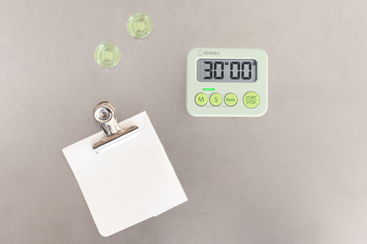 手のひらサイズのデジタルタイマーは、立てかけスタンドと強力マグネットが付いているので、置いて使うことも冷蔵庫などにくっつけて使用することもできます。