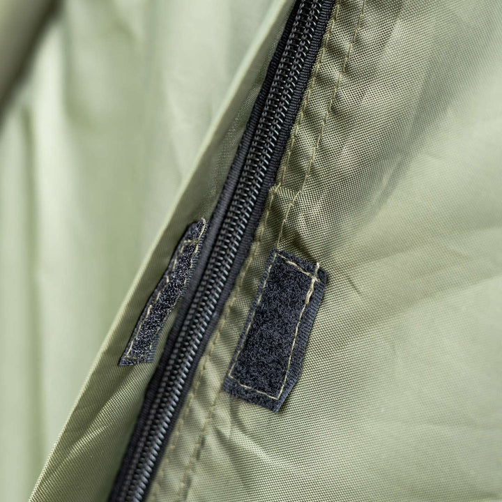 背面のファスナーの下はメッシュ素材のため通気性が抜群。屋根の尖った部分はテント内の暖まった空気を上部から排出する「トップベンチレーション」を採用しており、室内の空気を循環させながら快適さを保ちます。