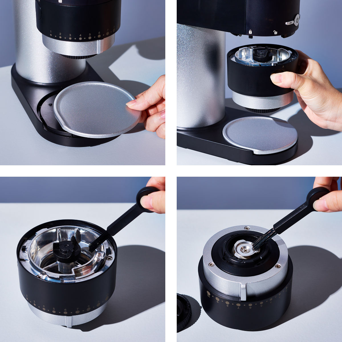 それぞれのパーツは本体から取り外せてお手入れが簡単にできます。ホッパーやコンテナ、受け皿は水洗い可能です。グラインドユニットは、水洗いできないため付属の専用ブラシで細部まで掃除が可能です。お手入れが簡単で長く清潔に使い続けることができます。