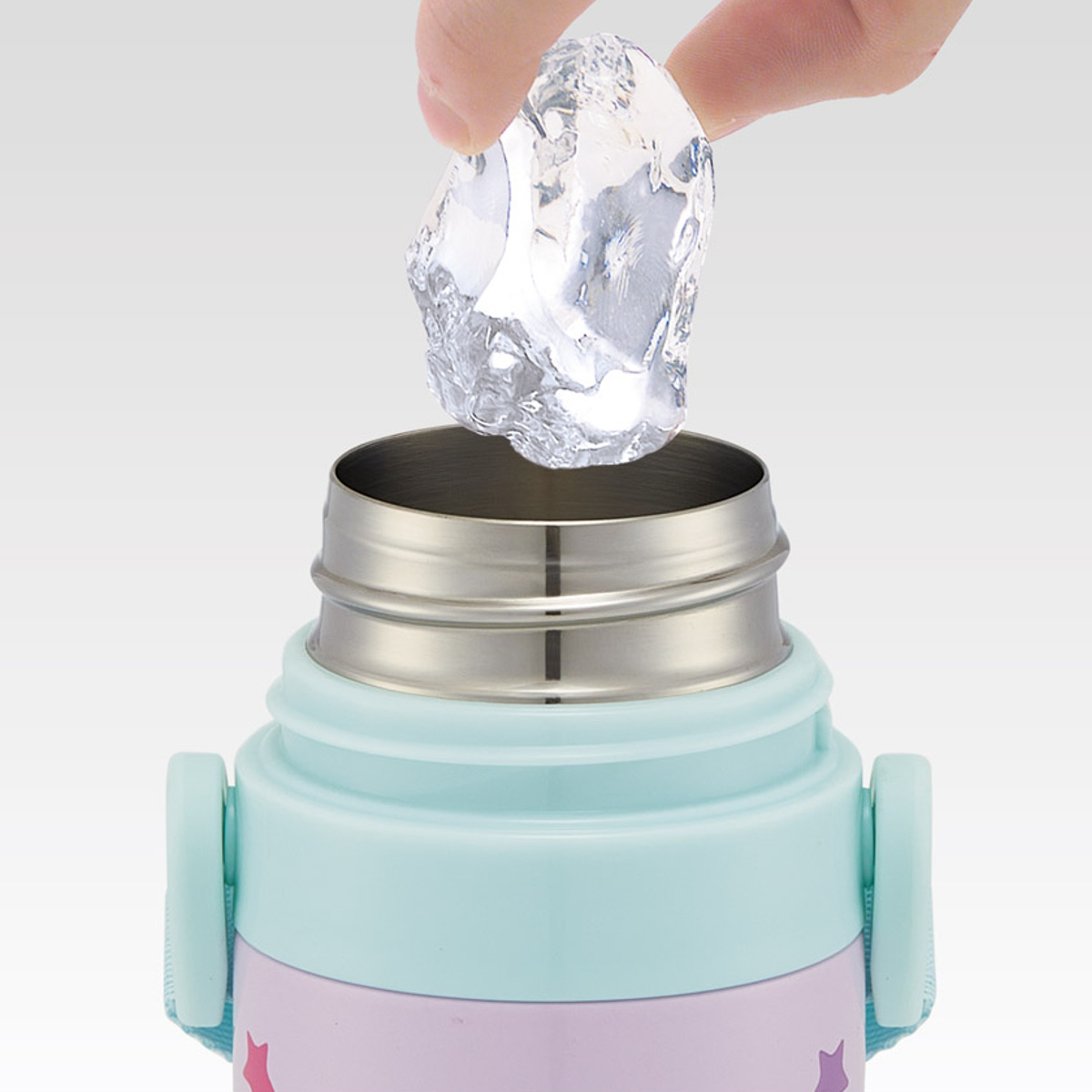 蓋と中栓を付けると、コップ飲みの水筒になります。温かい飲み物や冷たい飲み物にもご使用いただけます。