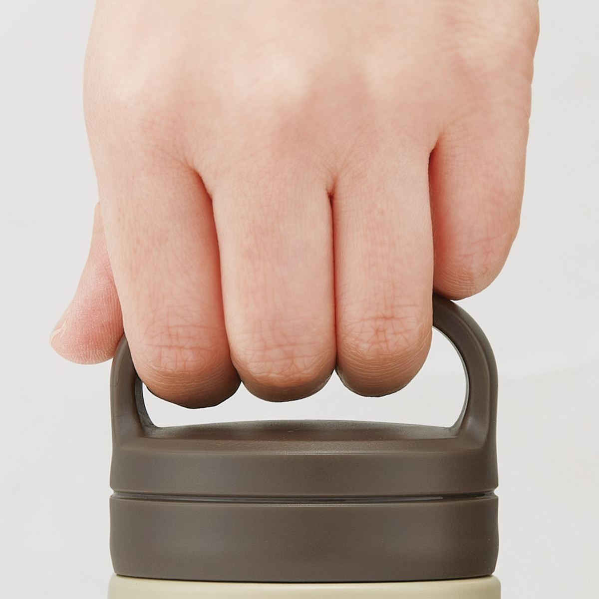 ハンドルに指を引っ掛けられるので、両手が塞がるほどの荷物が多い時でも持ち運べる便利な水筒です。オフィスや学校、お出かけの際に持ち運びやすいコンパクトサイズで普段使いにおすすめです。