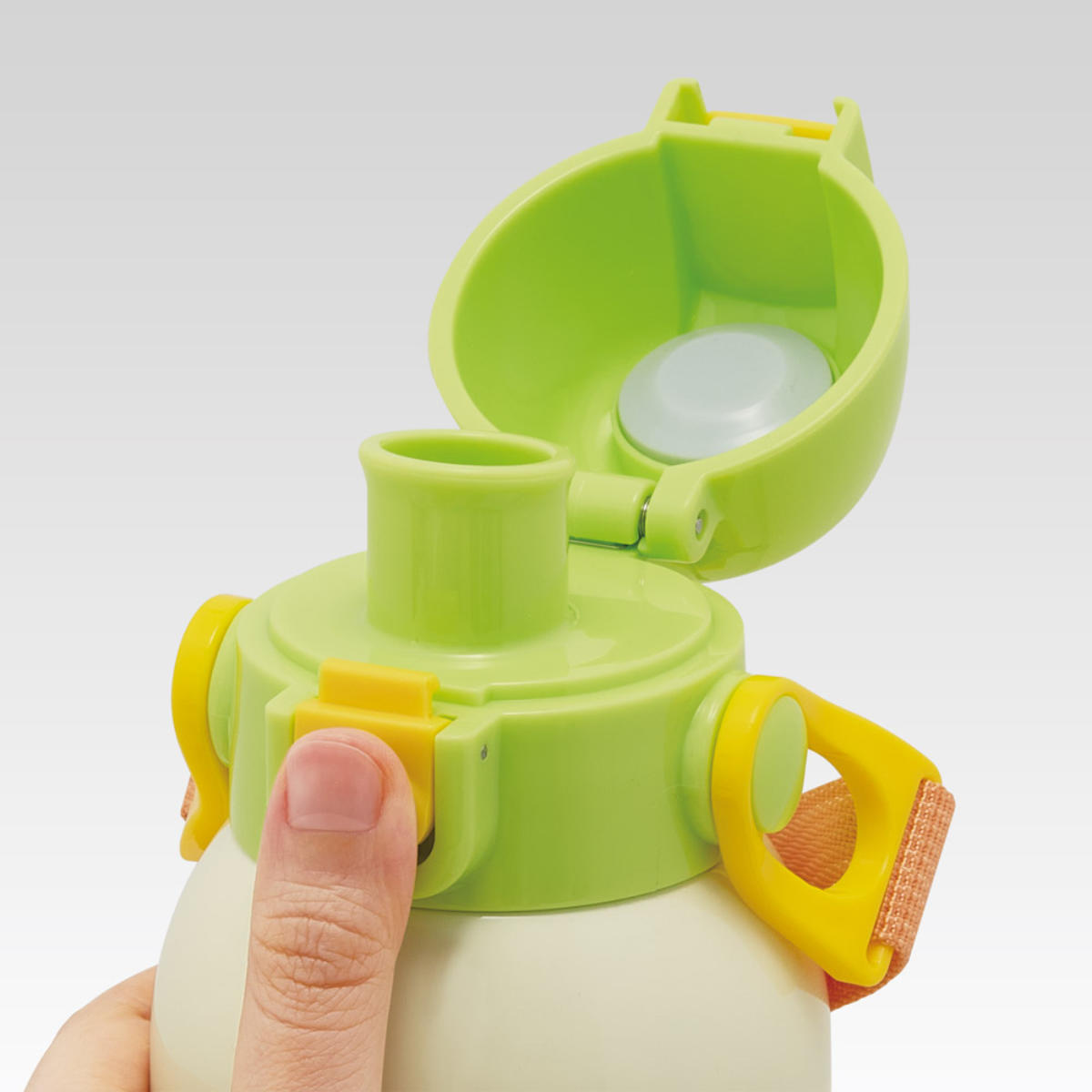 ●水筒の蓋はボタンを押すだけで開けることができるワンタッチ式です。