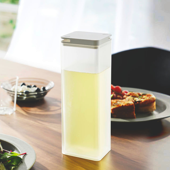 冷蔵庫のポケットに収納しやすいスリムで四角い形状です。冷蔵庫のドア開閉時も、水はね防止フィルターを蓋に取り付けることで水はねを防止します。