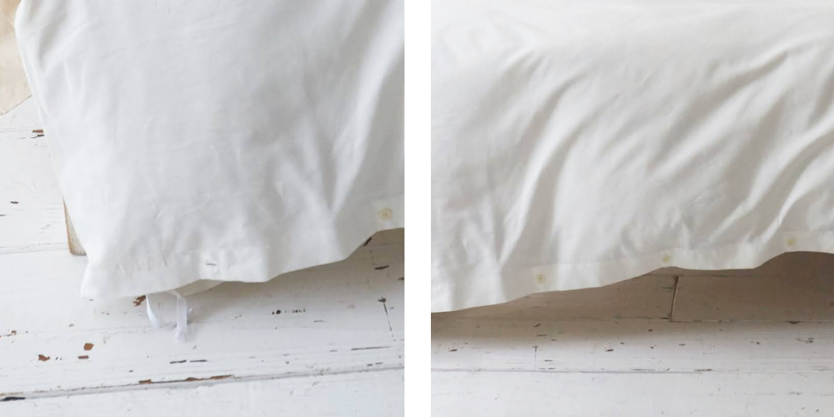 カバーの中でお布団がズレるのを防いでくれるヒモが、内側の四隅とその中央に計8ヶ所付いています。裾は全開するボタン式を採用しています。ボタン選びにもこだわり、生地の色に合わせました。