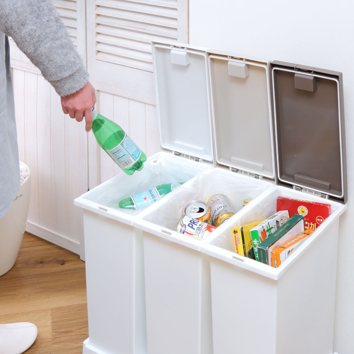 ペットボトル・カン・ビンなどを1台でまとめて分別できます。ゴミ箱をいくつも置く必要がなく、キッチン周りもすっきり。1か所で分別できるのでゴミ捨てがスムーズになり、自然と分別の習慣づけにもつながります。