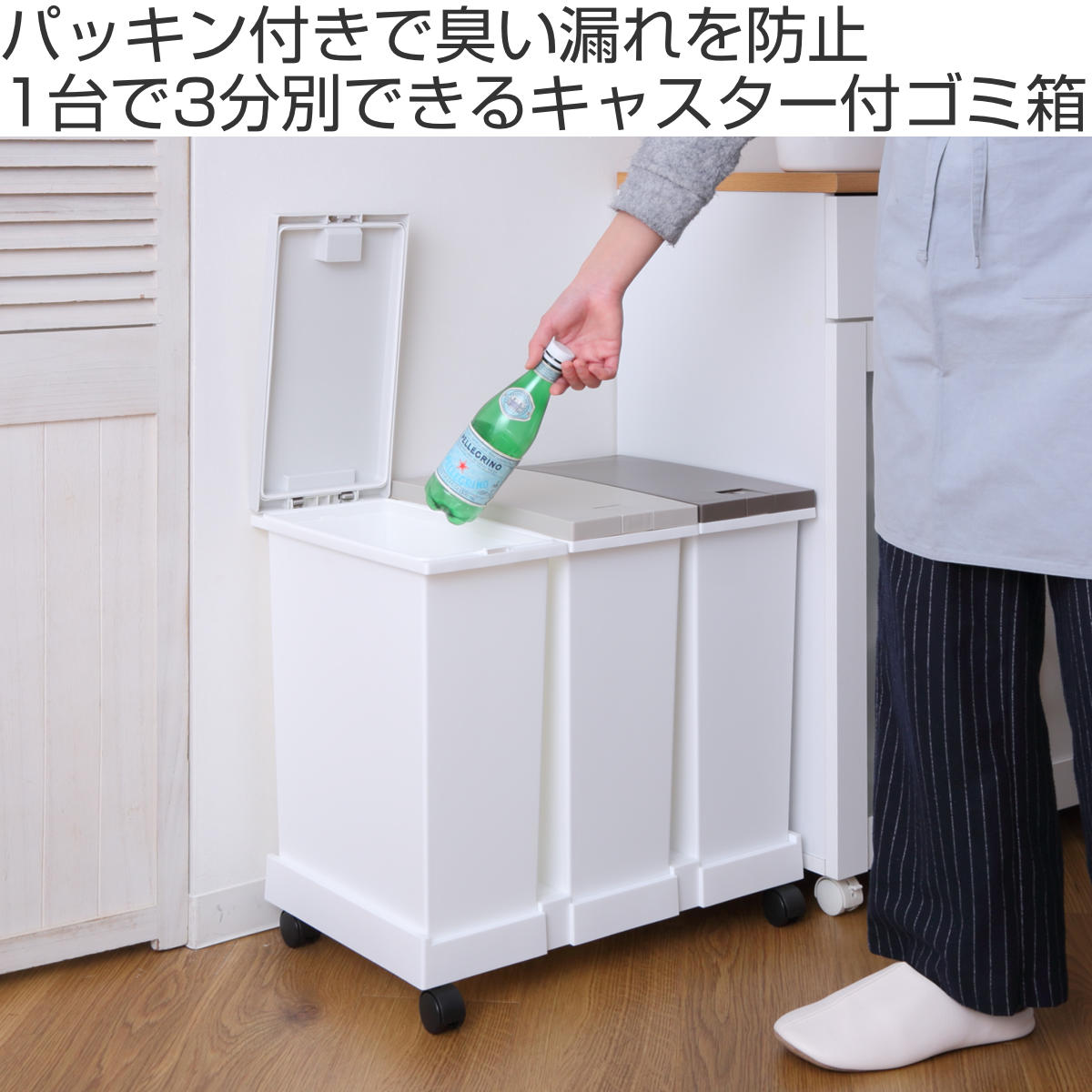 付属のキャスターを取り付ければ、ゴミ箱3個をまとめてスムーズに移動できます。掃除機をかけるときや床掃除の際も、持ち上げる必要がなく便利です。
