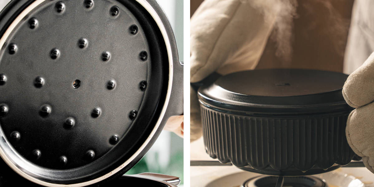 フタに施されたエンボス加工が、料理の水分と栄養を逃さず、しっとりとした仕上がりに。水蒸気がエンボス加工を通って食材に戻り、風味がアップします。