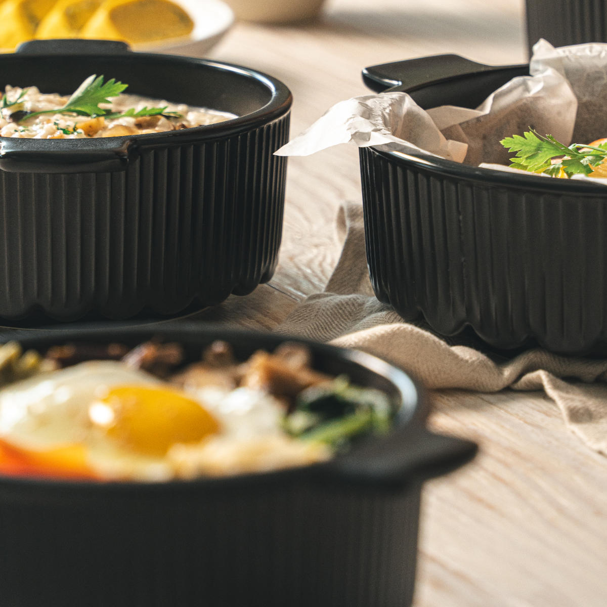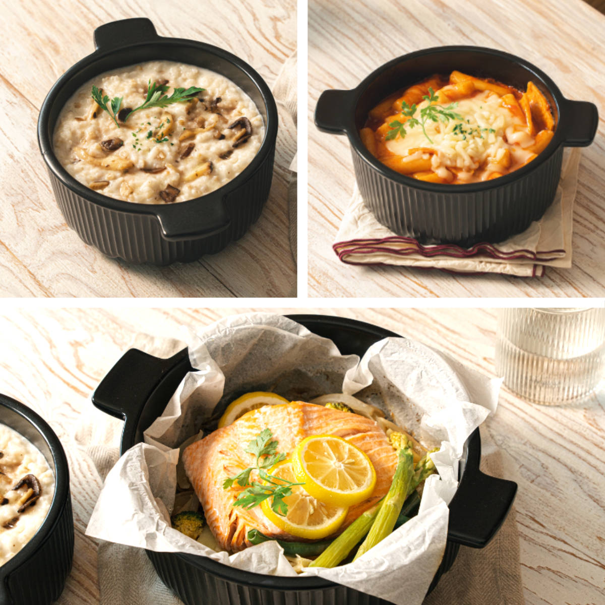 オーブンでも使用可能なため、煮込み料理から焼き料理までお楽しみいただけます。グラタン、クリームリゾット、サーモンパピヨット 、いつものお料理からスペシャルな一品まで、多種多様なお料理まで作れます。