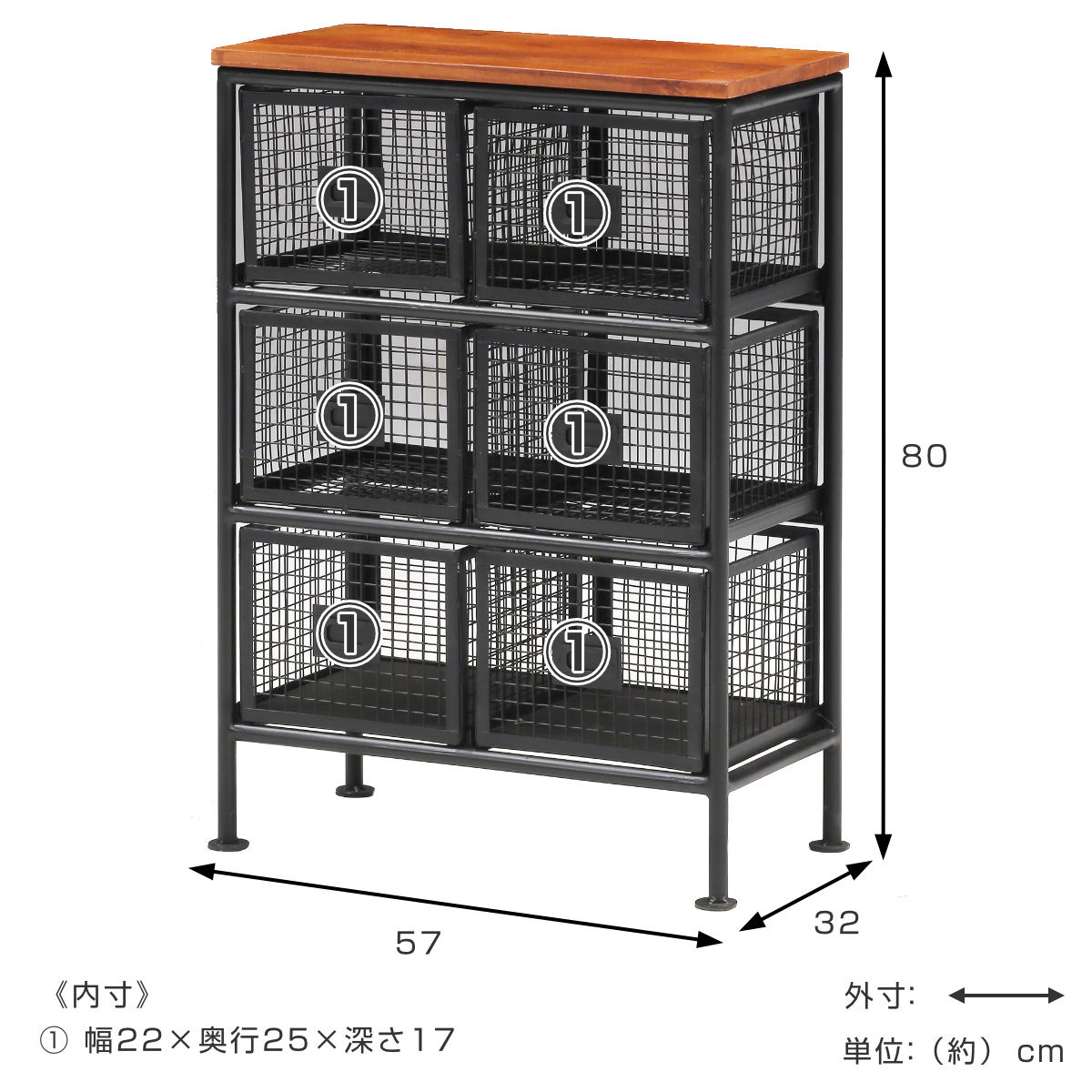 スチールメッシュ チェスト 幅57cm 引出し6杯 木天板 完成品