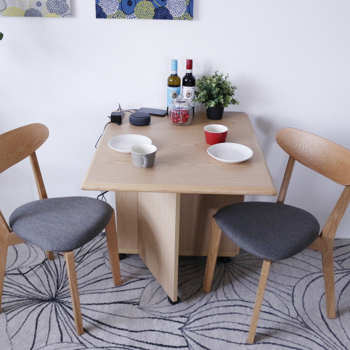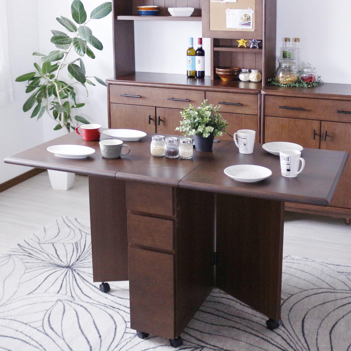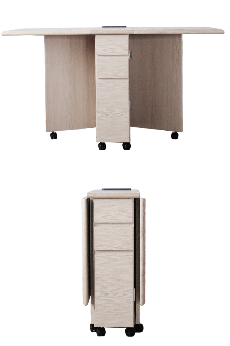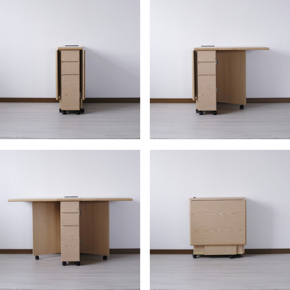 生活シーンに合わせて形を変えられるキャスター付きのテーブルです。広く使いたい場合には両側を開き、一人作業や狭いスペースでは片側の天板のみを広げてお使いただけます。天板を畳んだり広げたりする事で、生活の様々なシーンに合わせて多様な使い方ができます。
