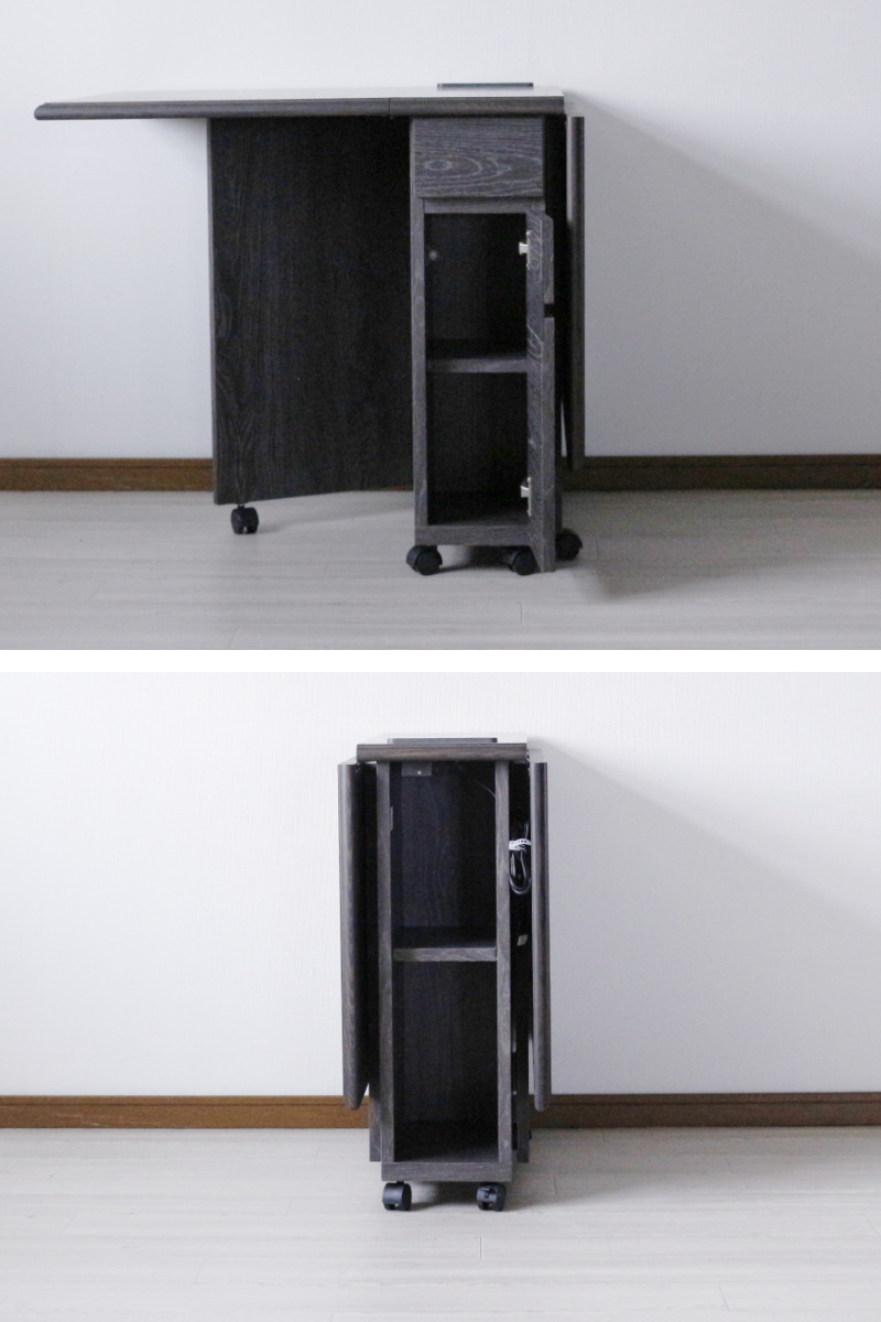 両側の天板を閉じるとコンパクトに折りたたむことができるので、狭いスペースにも収納することができます。