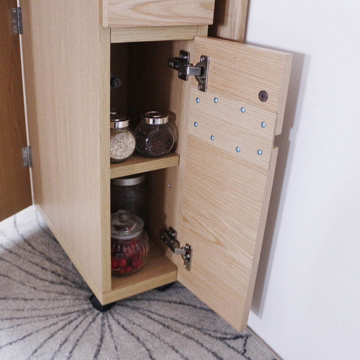 正面には扉収納、背面にはオープン収納が付いています。扉収納には、アイテムを隠すように収納することができ、見た目もスッキリ片付いた印象になります。オープン収納には、収納物がサッと取り出しやすく、よく使うアイテムを片付けるのにもピッタリです。