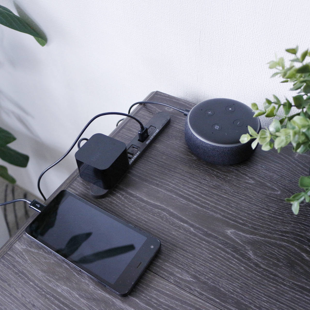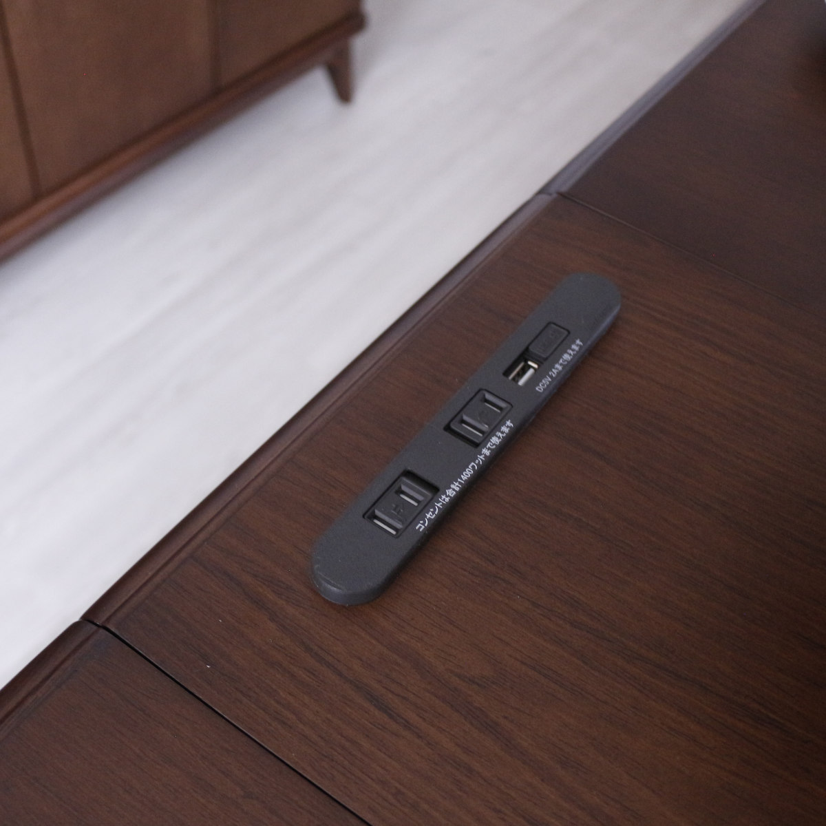 天板上の電源タップには、USBポートとコンセント口を設置しています。手近なところから電源を取れるので、配線がまとめやすく便利です。スマートフォンの充電、USB電源の加湿器や扇風機など、家電製品も手軽に使えます。