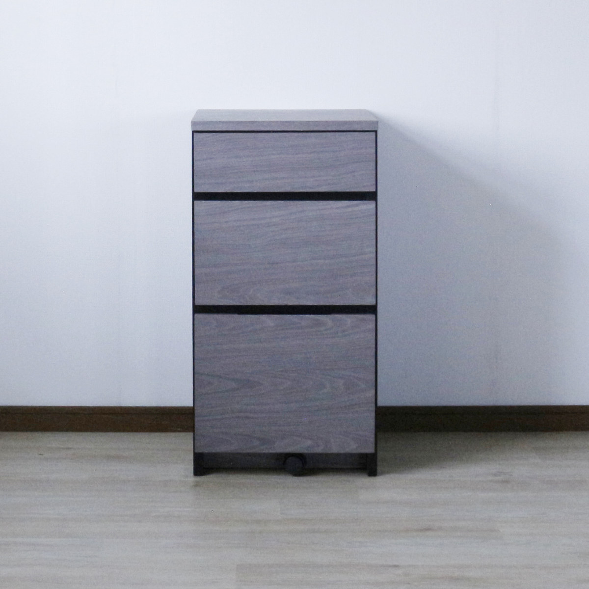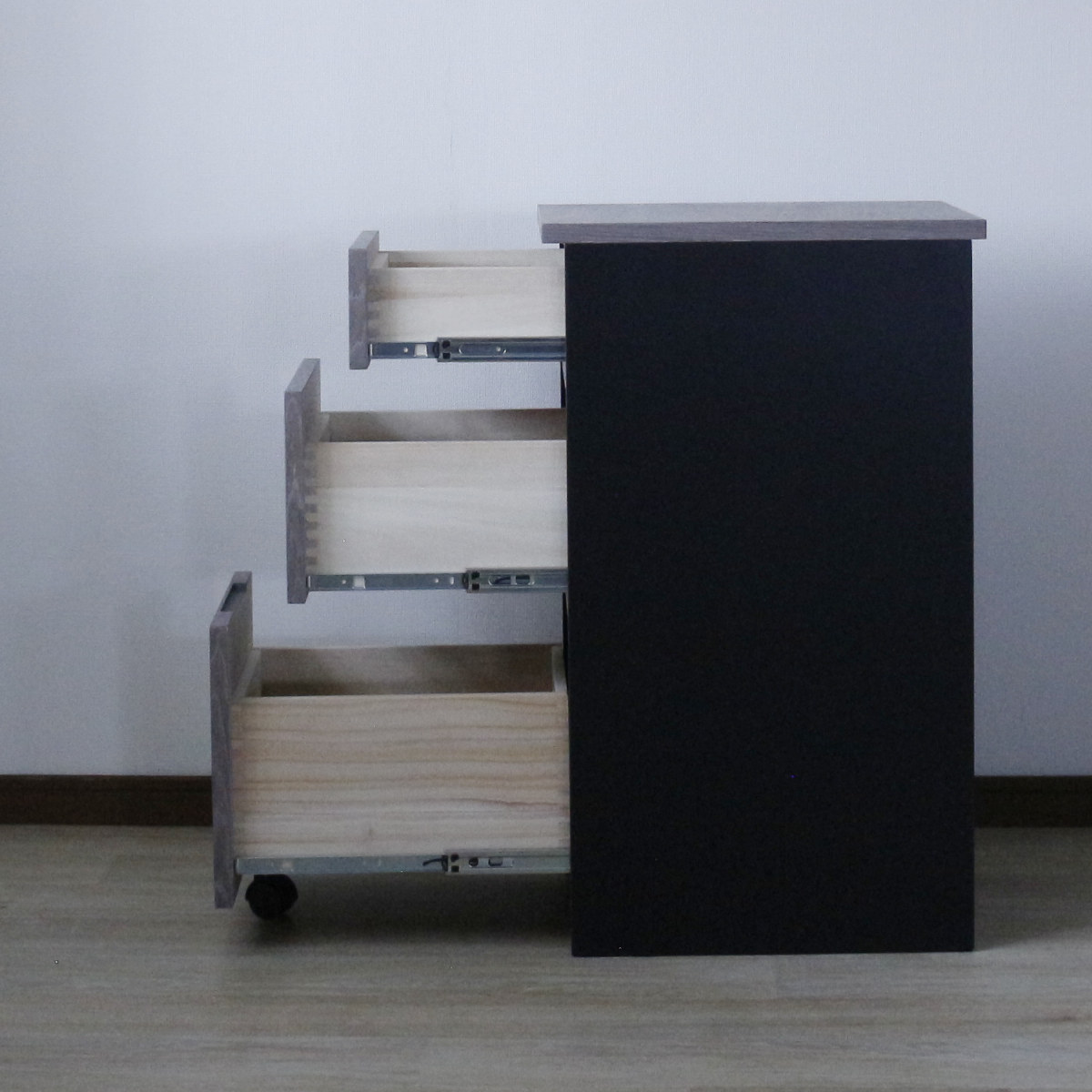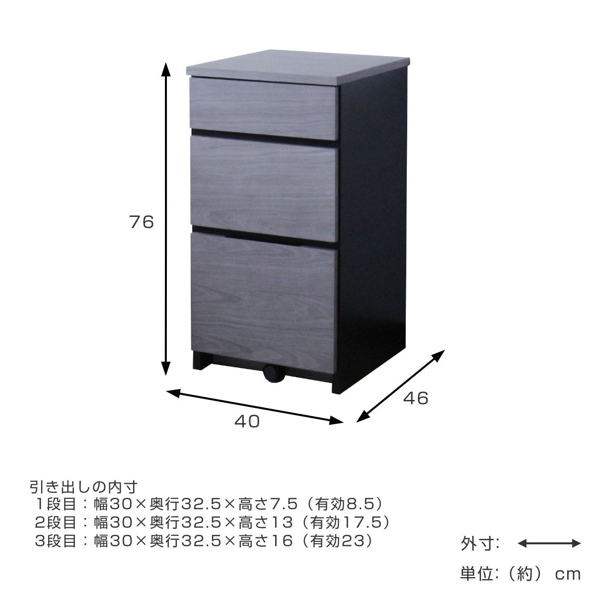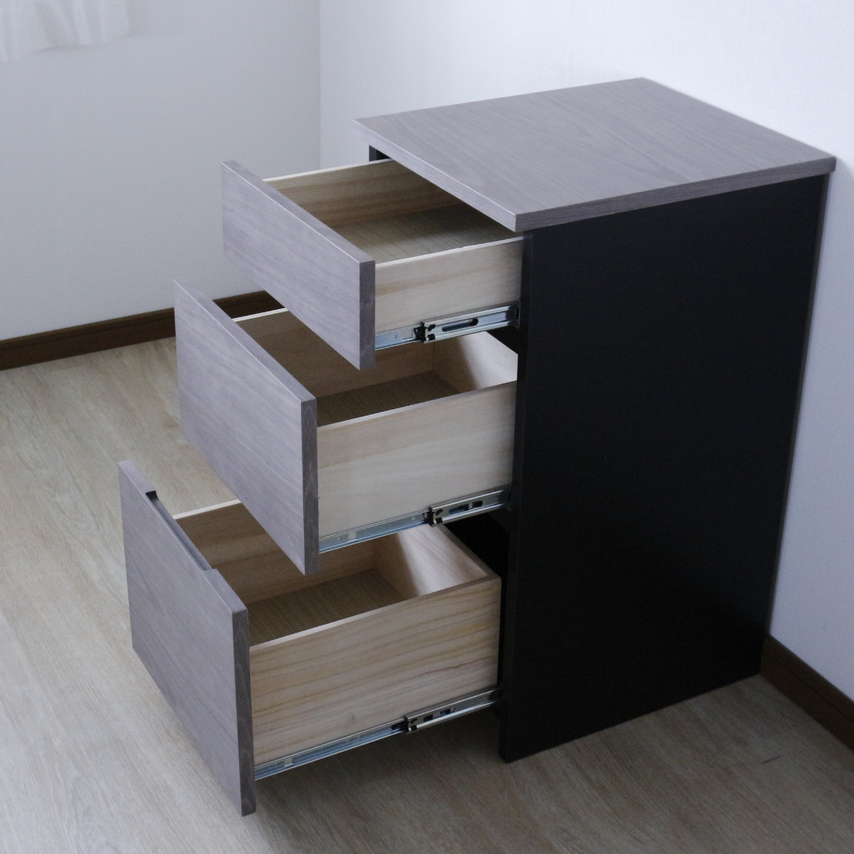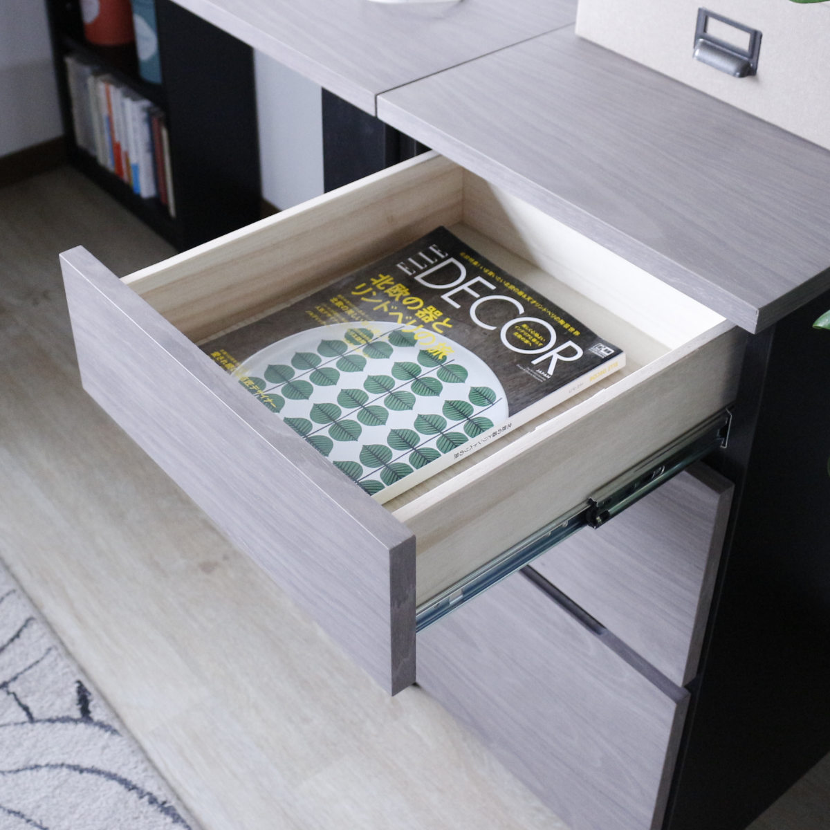 引き出しは3段とたっぷり収納ができ、筆記用具や書類、本などもサッと片付けられます。また、レール式になっているのでスムーズな開閉が可能です。