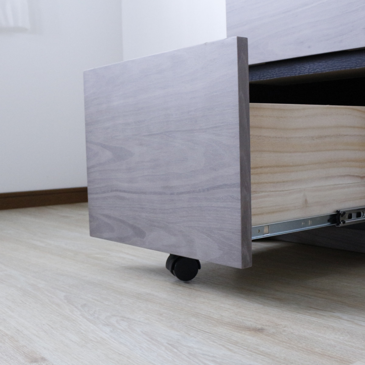 下段の引出しの前倒れを防ぐキャスターが付いています。重たくてもラクに引き出すことができます。