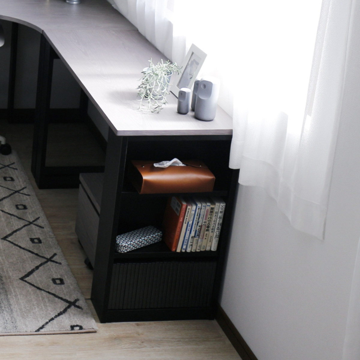 脚の1つには本や小物などを収納することができるラック脚になっております。ラック脚に収納することにより、机の上がスッキリ片付きます。