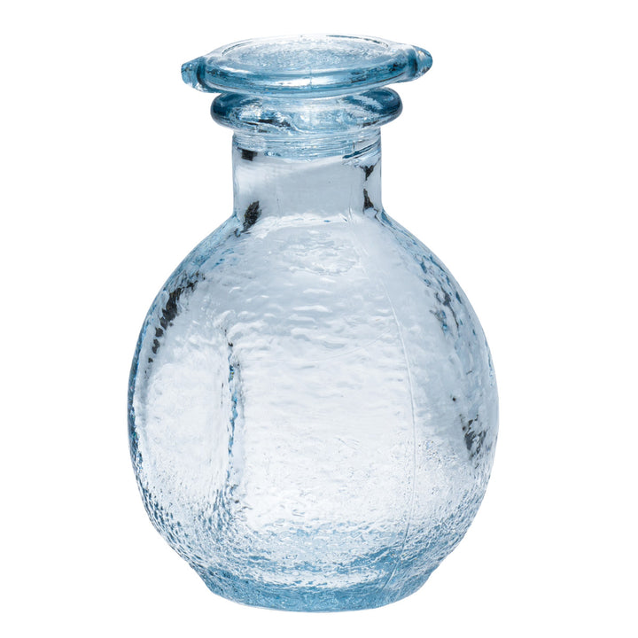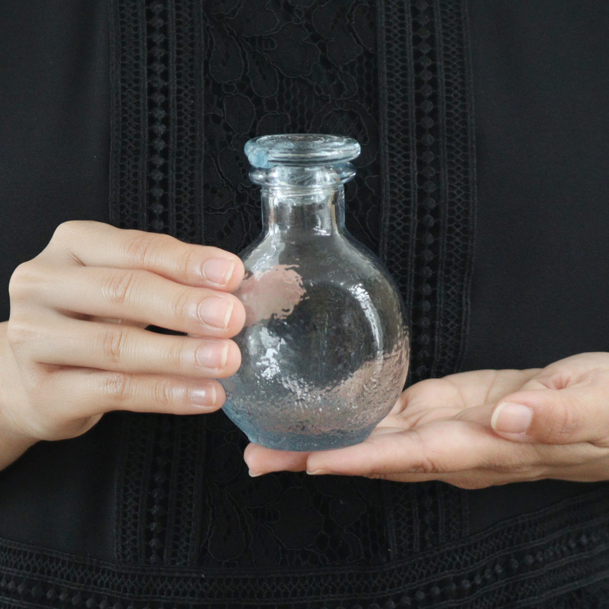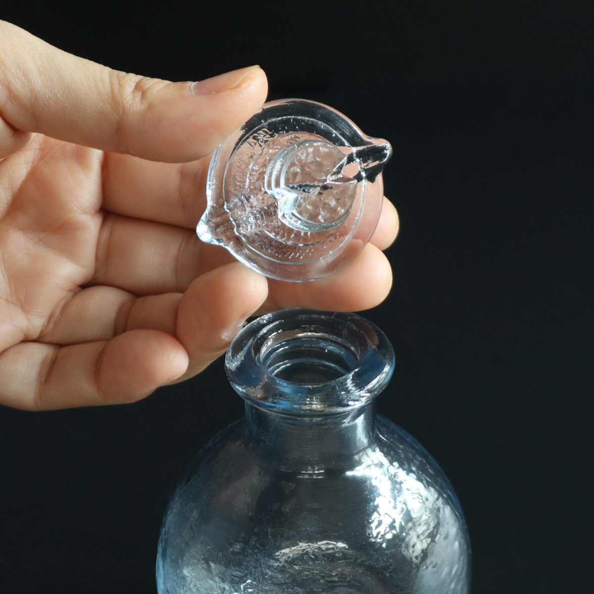 どこか懐かしさを感じる、ころんとしたガラスの醤油差しです。薄っすらとブルーがかったガラスが、食卓に爽やかな印象を与えます。