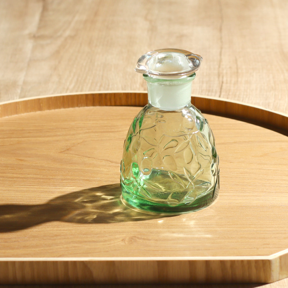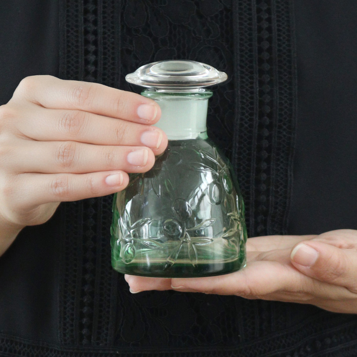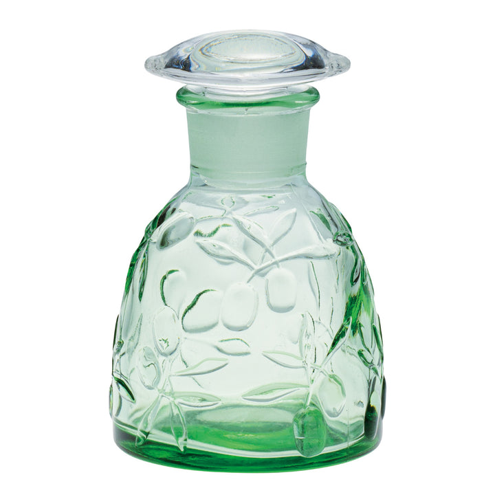 レトロな雰囲気のオリーブ柄がかわいらしい、ガラスの醤油差しです。薄くグリーンがかったガラスが美しく、食卓に優しい雰囲気をもたらします。