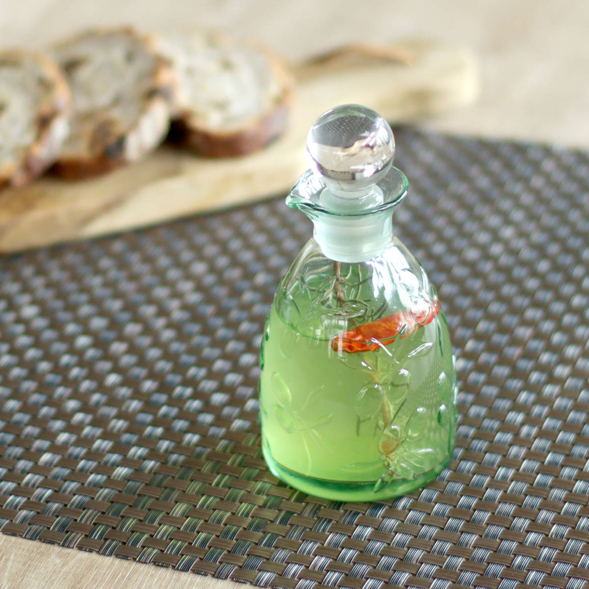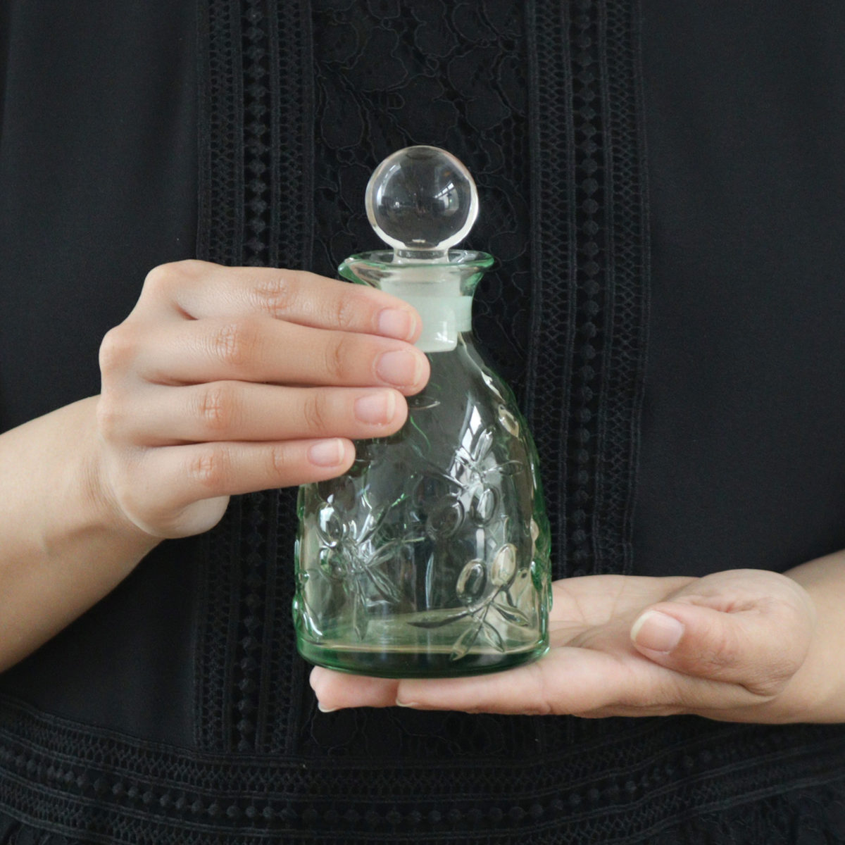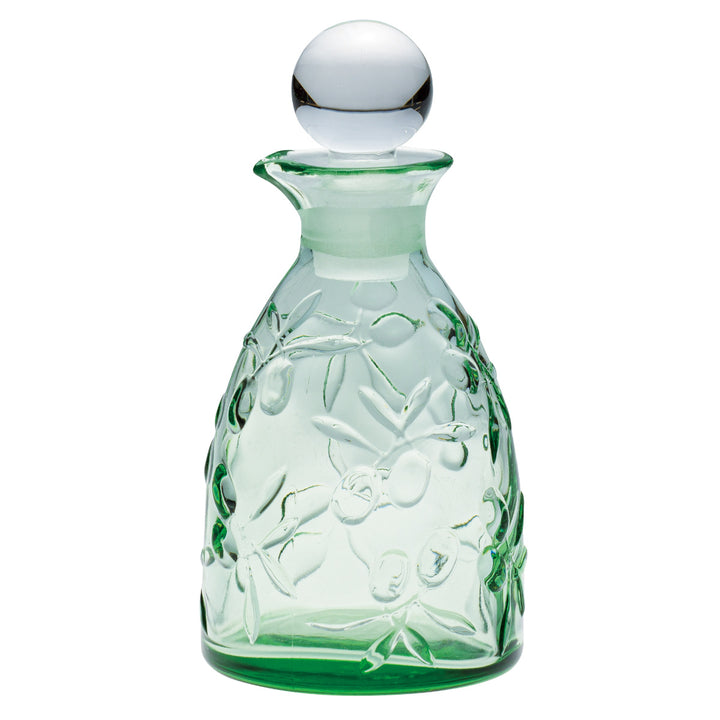 レトロな雰囲気のオリーブ柄がかわいらしい、ガラスのドレッシングボトルです。薄くグリーンがかったガラスが美しく、食卓に優しい雰囲気をもたらします。