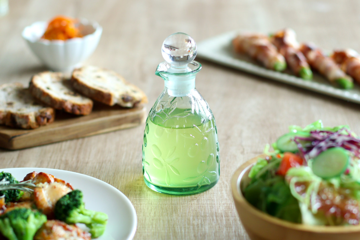 自家製ドレッシングやハーブオイル、ビネガーなどの調味料入れとして活躍します。ガラスは色やニオイが付きにくく、衛生的な点も魅力です。