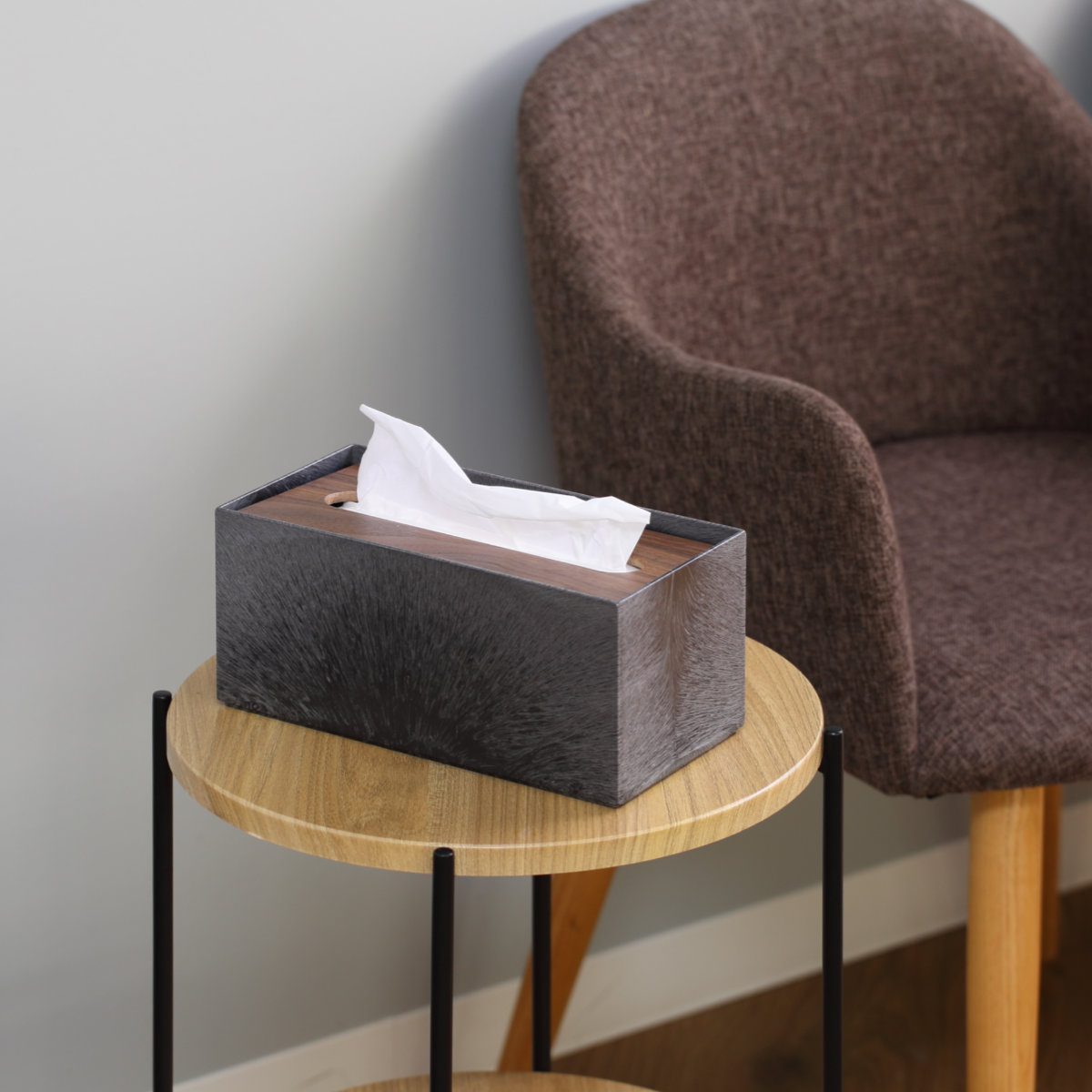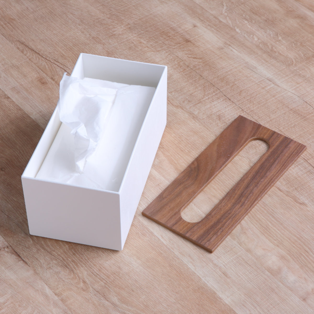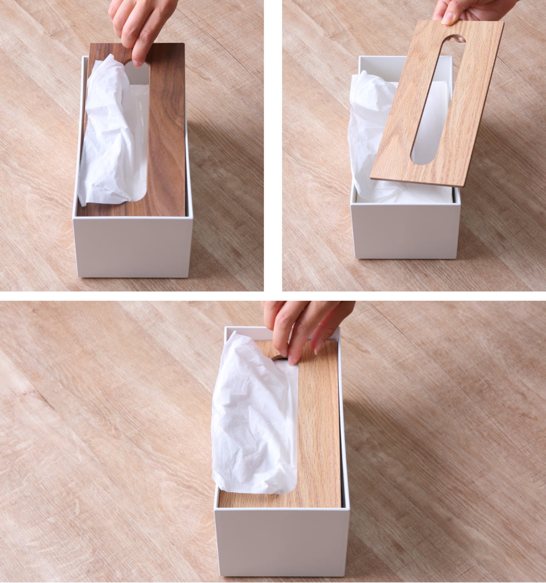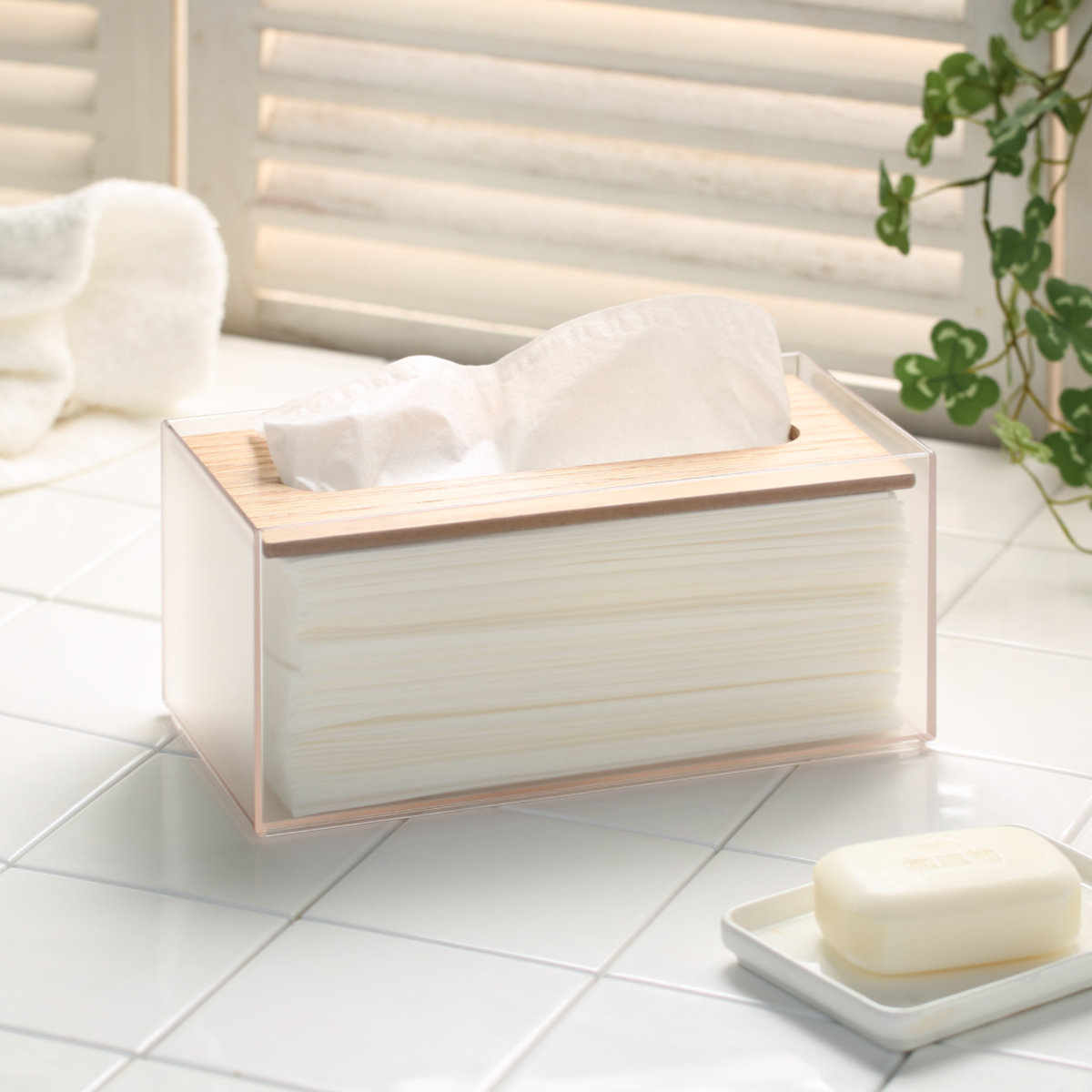 プラスチック素材と木蓋の異素材ミックスが目を引くティッシュケースです。木蓋は木目の出方が異なる天然木を使用しているのでひとつひとつ違った表情をお楽しみ頂けます。