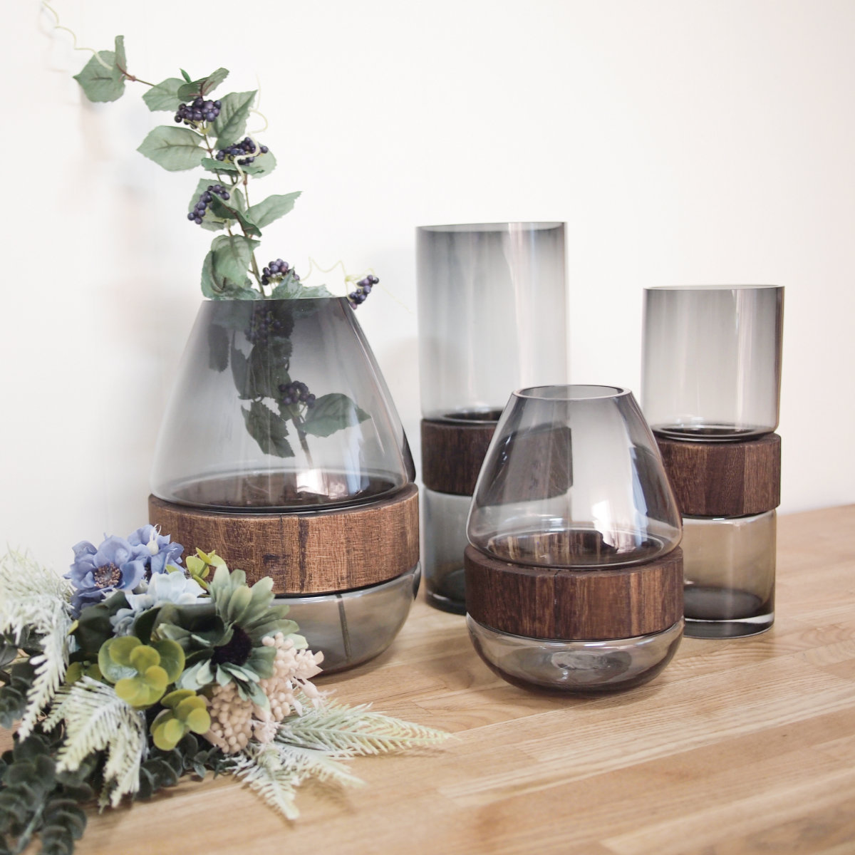 ●アンティークカラーの木とスモーク色のガラスの異素材がオシャレなガラスベースです。