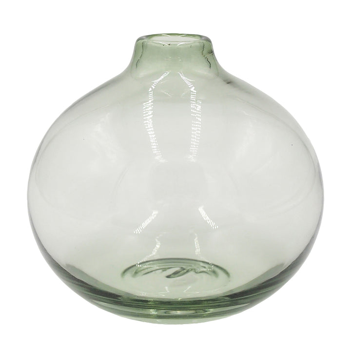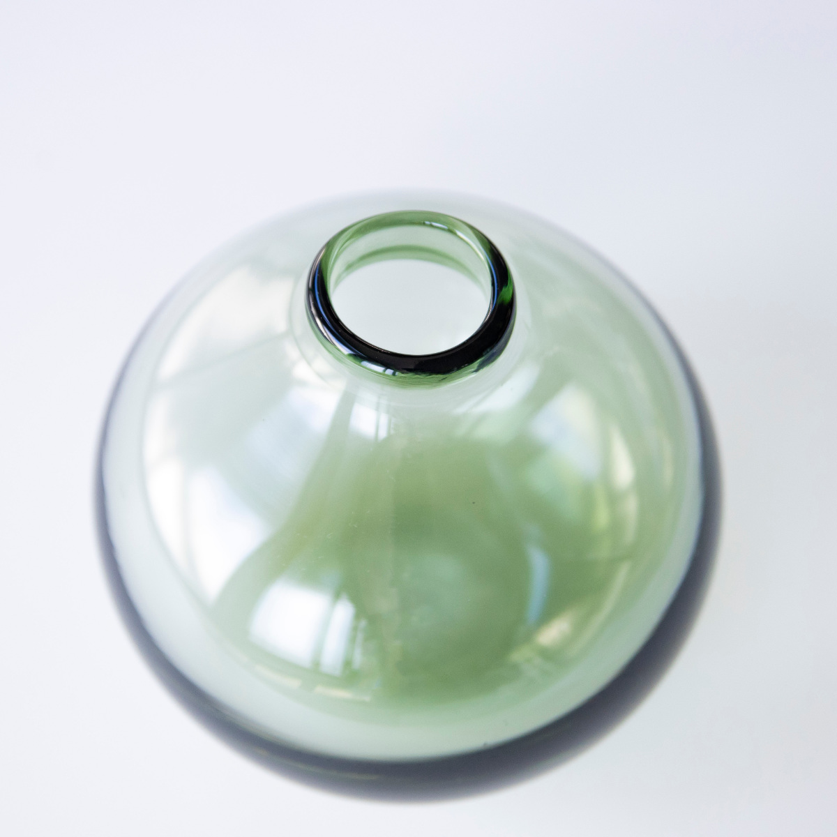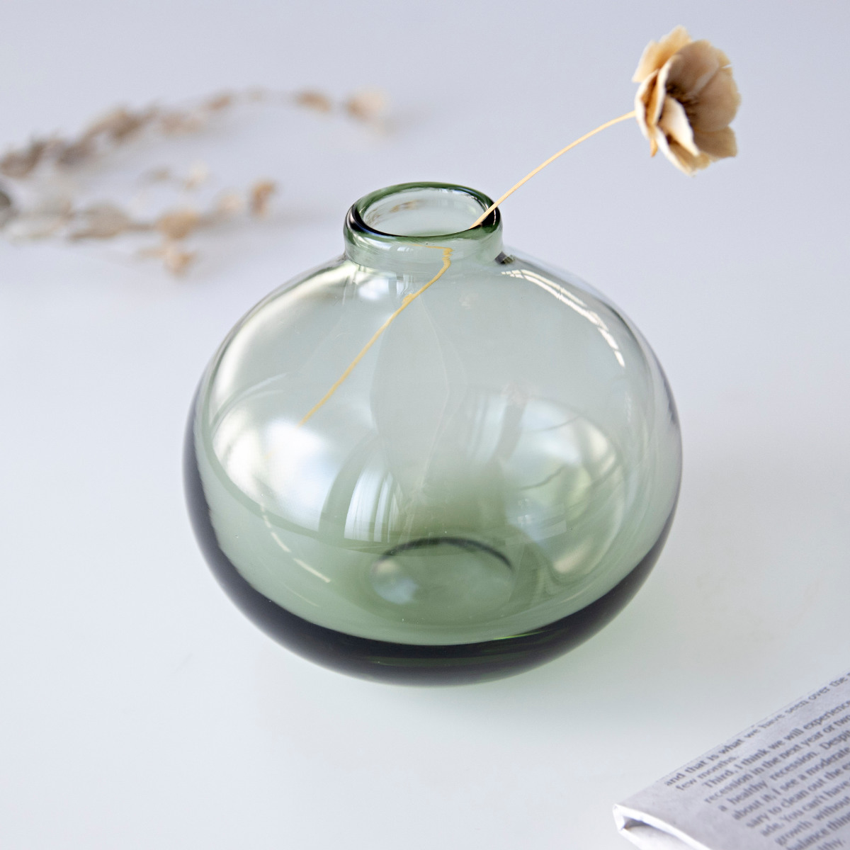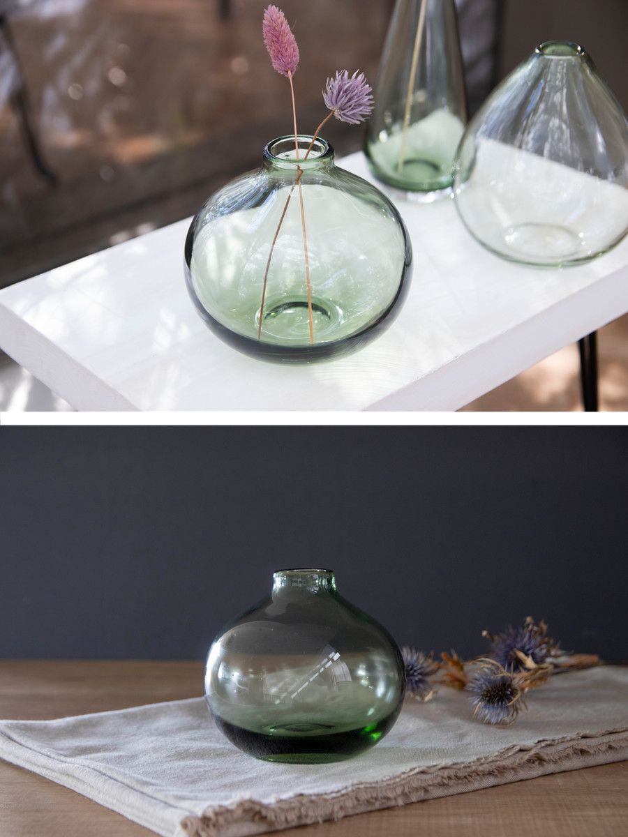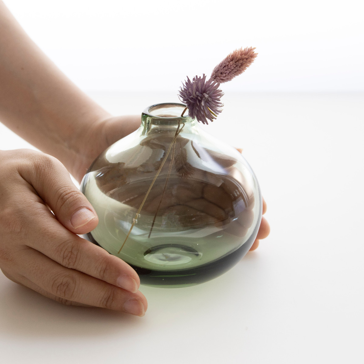 ぽってりとした厚みがかわいい、優しいグリーンカラーのガラスベースです。一輪挿して飾るだけで、インテリアの素敵なアクセントになります。ガーデニング好きの方はもちろん、お店のディスプレイとしてもおすすめです。