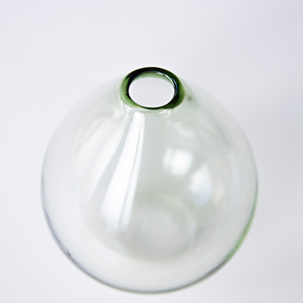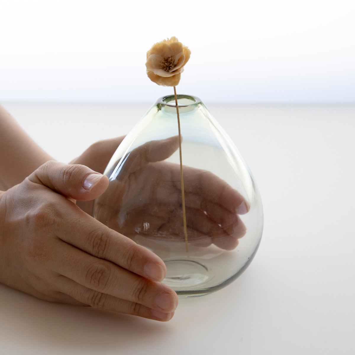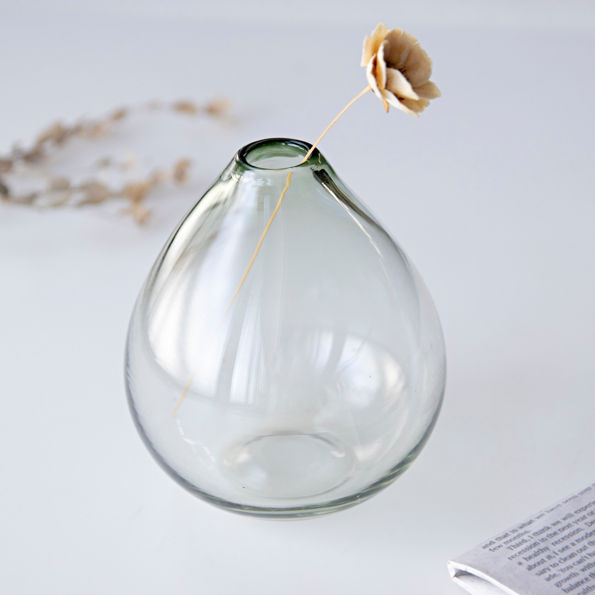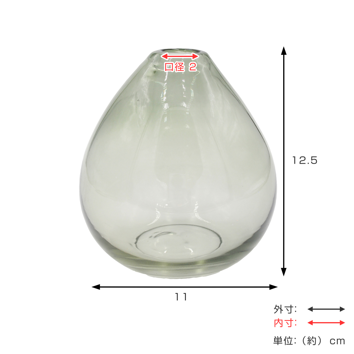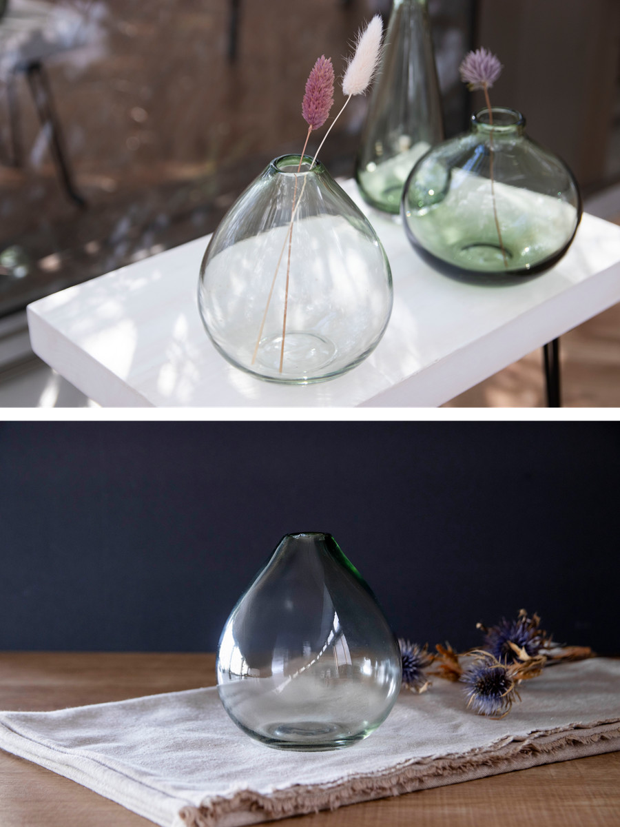 ぽってりとした厚みがかわいい、優しいグリーンカラーのガラスベースです。一輪挿して飾るだけで、インテリアの素敵なアクセントになります。ガーデニング好きの方はもちろん、お店のディスプレイとしてもおすすめです。