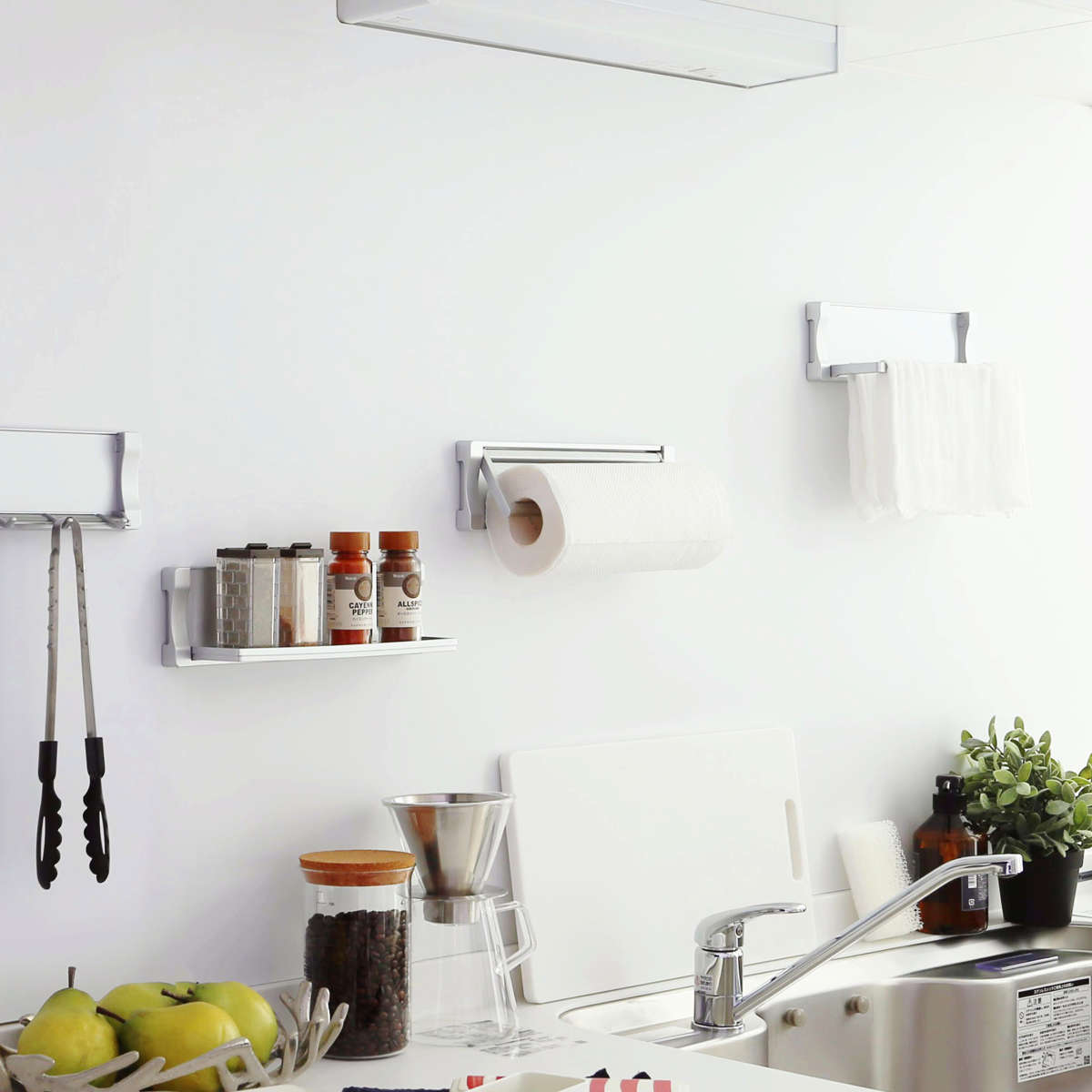 マグネットで浮かせられるので、キッチンのデッドスペースを有効活用できます。また身長や作業台の高さなどに合わせて、心地よく使える高さに取り付けられます。耐荷重は1本につき約300gです。