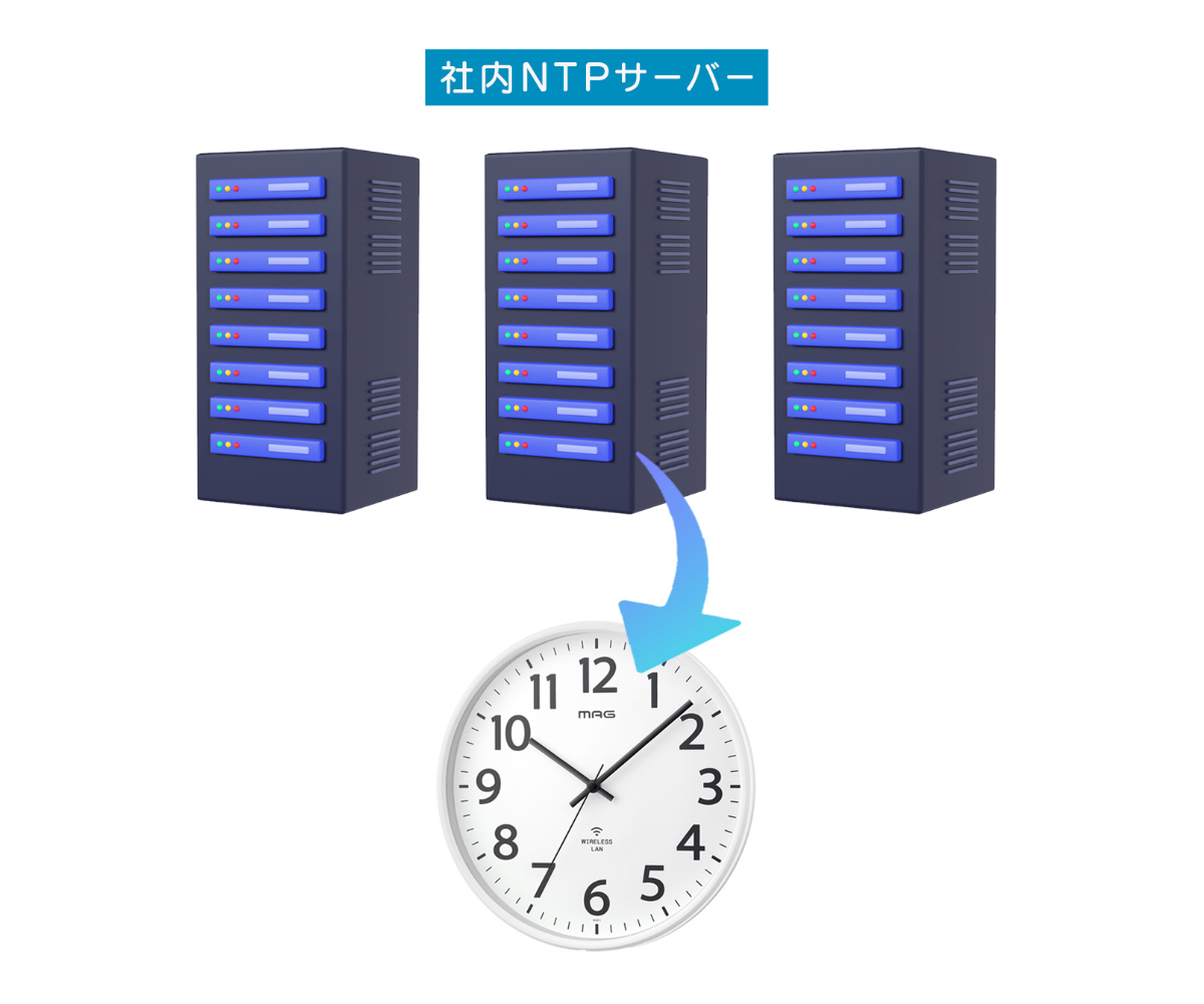 施設内の一つのネットワーク時刻情報(NTP)に同期するため、それぞれの時計個体による時間差が発生しません。複数の部屋を利用するビジネスシーンや試験会場などでのご利用もおすすめです。