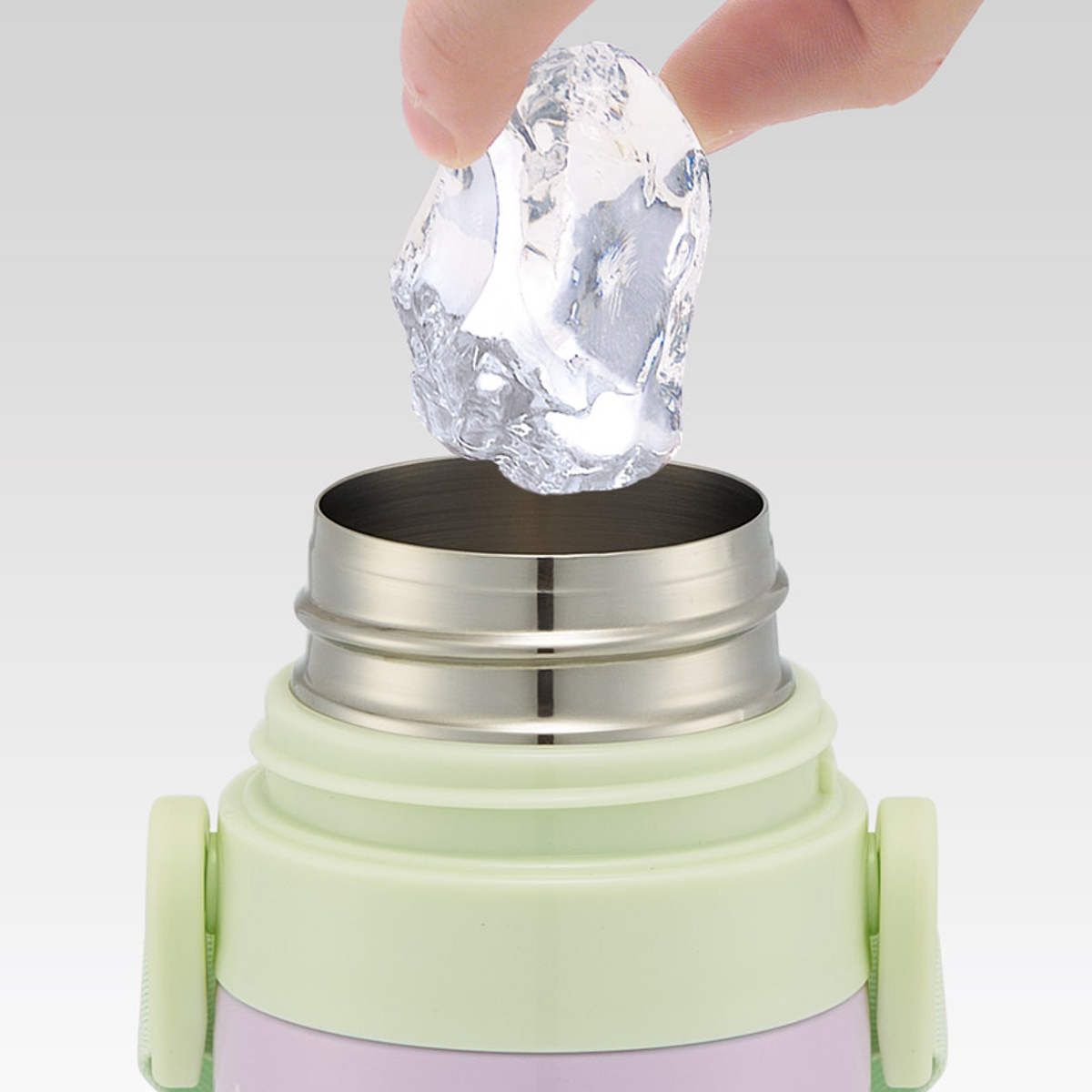 蓋と中栓を付けると、コップ飲みの水筒になります。温かい飲み物や冷たい飲み物にもご使用いただけます。