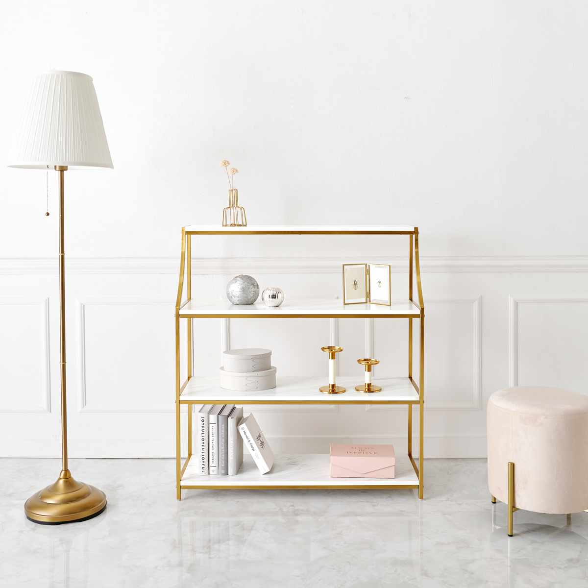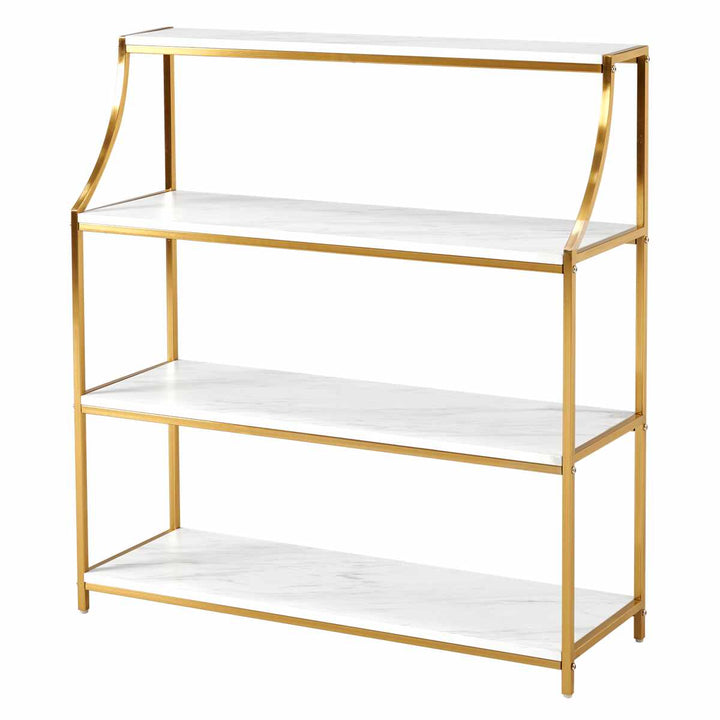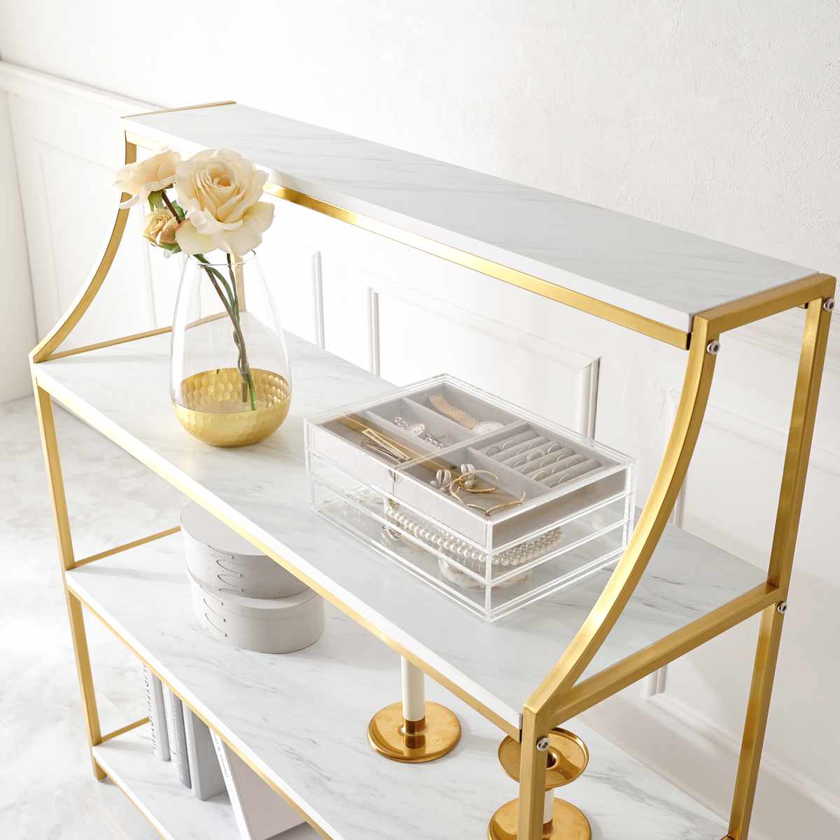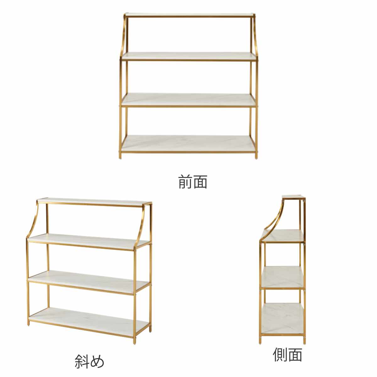お部屋を華やかに彩る、エレガントなオープンラックです。天板には大理石調のシートを使用しているので、置くだけで高級感のあるホテルライクな空間になります。ラグジュアリー感漂うゴールドのフレームがお部屋に華やかさをプラスします。