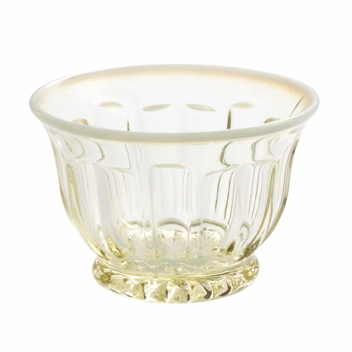 手にしっくりと収まる小さ目サイズのガラスの冷茶です。豆皿と合わせればかわいらしい冷茶セットになります。乳白色な色合いがレトロな雰囲気と光を通した際の透け感も楽しめます。陶器や透明なガラス食器とはまた違う味わいを演出します。