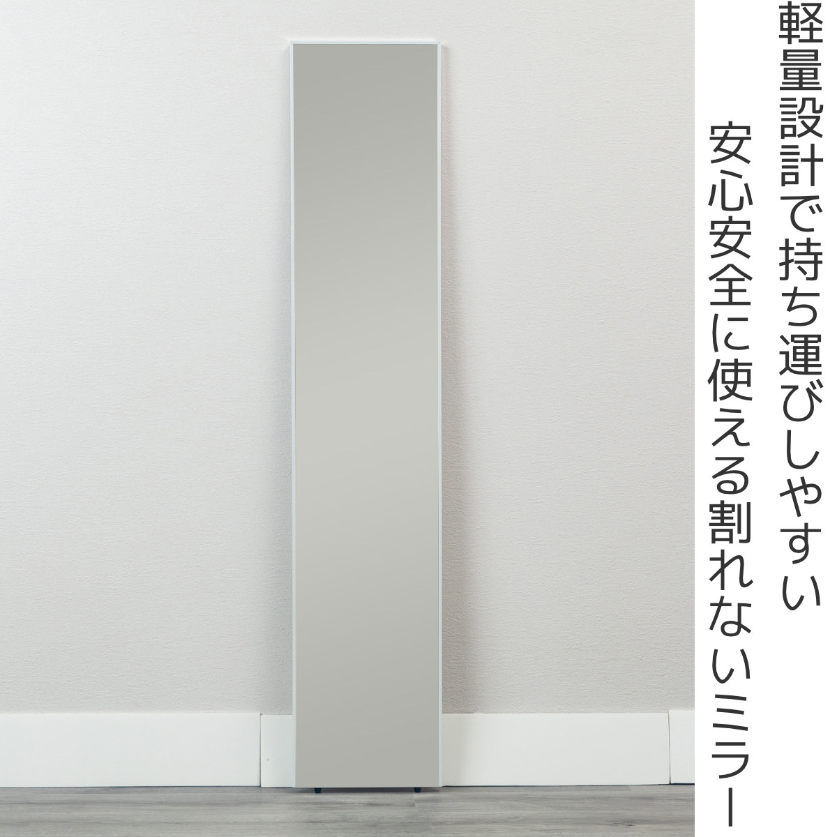 4層構造にしたポリエチレンテレフタレートの高性能フィルムを使用したミラーです。ガラスを使用していないため割れることがなく、小さなお子様がおられるご家庭でも安心してお使いいただけます。