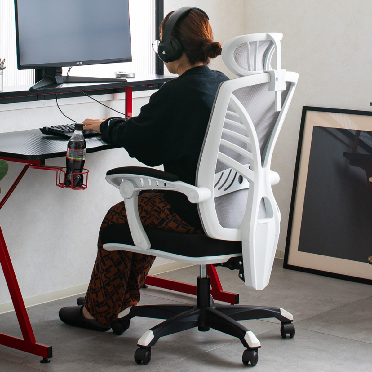 ヘッドレストと背もたれにメッシュ素材を使用しています。通気性が良く蒸れにくい上、伸縮性があり身体にフィットする素材です。